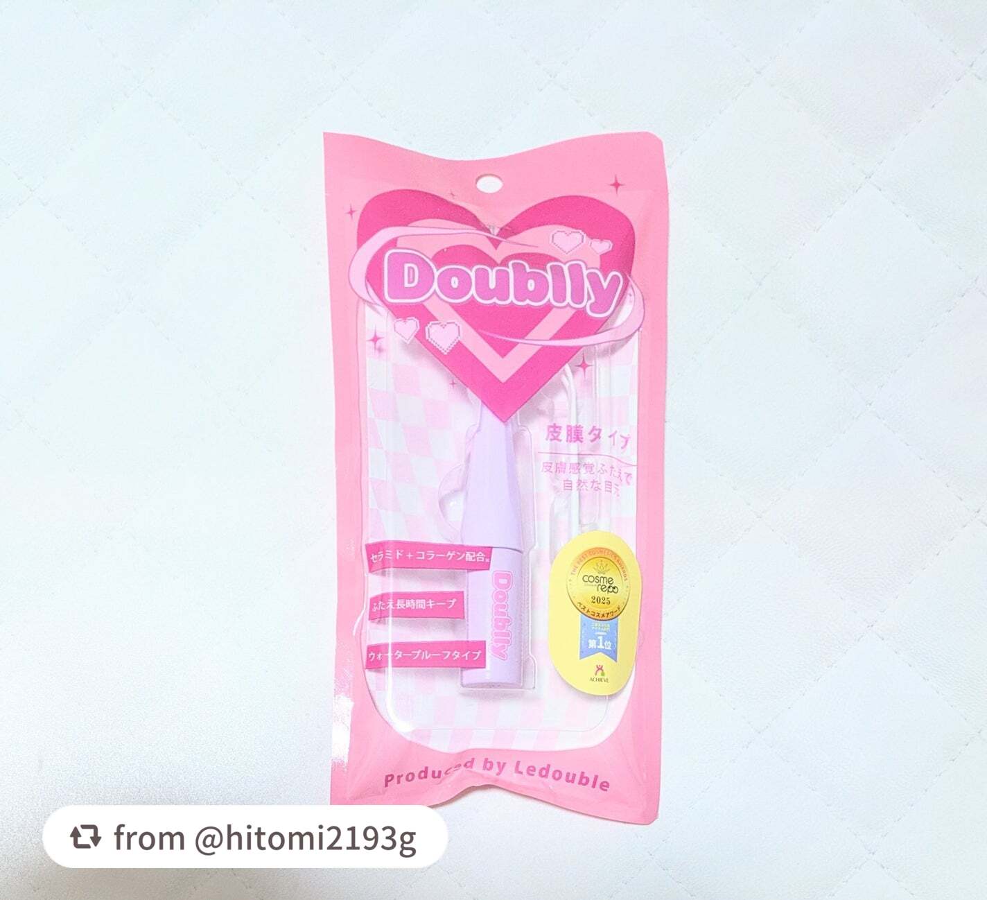 - Produced by Ledouble〈Doublly〉 二重まぶた形成化粧品「ルドゥーブル」から新シリーズ「ダブリー」新発売! 「引締り・保湿力・速乾性」がパワーアップして、より使いやすさにこだわりました。 塗布したリキッドが特殊な人工皮膜に変化し、まぶたをギュッと折り込みきれいな二重に。 人工皮膜は無色透明・テカリにくい・白浮きしにくく・まぶたにピッタリ密着します。 使っているのがわからないほど自然でキレイ。 ウォータープルーフタイプなので長時間キープ。 うるおい成分セラミド・コラーゲンW配合。 ダブリーは塗って乾かすだけで目元の印象が変わるので、毎日メイクで簡単にお使いいただけて、アイシャドウの発色、ラメ感もキープされメイクも楽しめちゃう! 年齢、性別にへだたりなく、美しい目元を演出します。 一重・奥二重の方はぱっちり二重に。 二重の方は幅広二重に。 年齢を重ねた大人のまぶたもスッキリ二重に。 塗り方ひとつで、色々な目の形の方々にご使用いただけます。