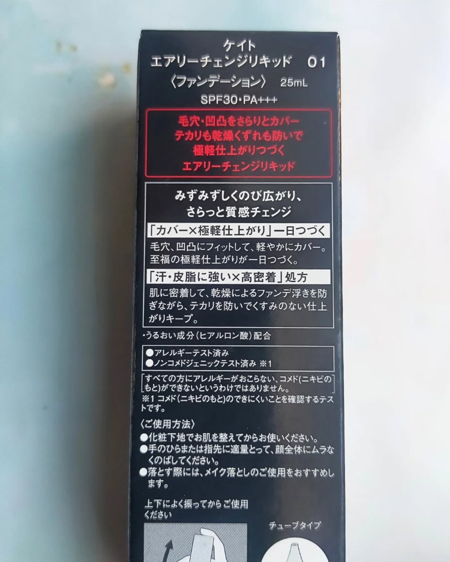 - SPF30・PA+++ さらりと変化。テカリも乾燥くずれも防いで極軽仕上がりをキープする 新リキッドファンデーション「エアリーチェンジリキッド」登場。 ■うるおい成分配合(ヒアルロン酸) ◆アレルギーテスト済み ◆ノンコメドジェニックテスト済み※ ※コメド(ニキビのもと)ができにくいことを確認するテスト すべての方にアレルギーがおこらない、コメド(ニキビのもと)ができないというわけではありません。