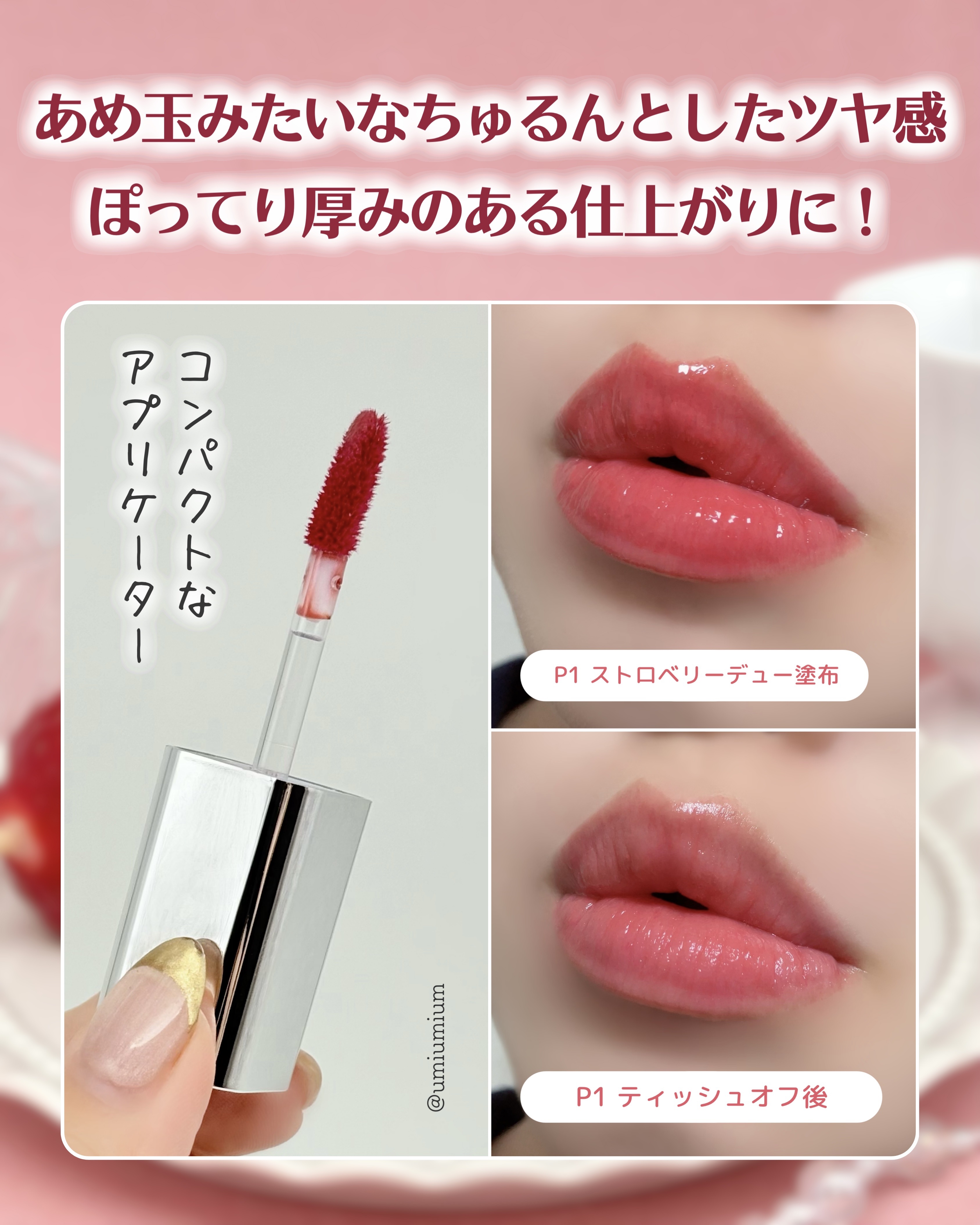 - ●クリアキャンディコーディング処方 あめ玉のようにクリアで厚みのあるオイルベールで、ジューシーな唇に。 ●つけたてカラーが長持ち 高粘度のオイルが密着性を高め、時間が経ってもカラーキープ。 ●3種のうるおう美容液成分in オリーブ果実油、アルガニアスピノサ核油、ウンシュウミカン果皮エキス(すべて保湿成分) 2024年10月23日(水)ポップアップストアにて先々行販売 2024年10月30日(水)アットコスメトーキョー・アットコスメオーサカにて先行販売 2024年11月1日(金)全国発売