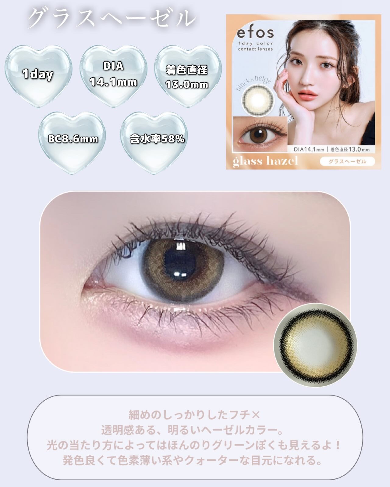 efosのカラコンは着色直径が13.0mmと自然な大きさだから使いやすい! カラーやデザインも瞳に馴染んでナチュラルに変化を与えてくれるようなレンズが多い🖤 大人かわいいナチュラルレンズ💫 efos全8色レビュー🫧✨