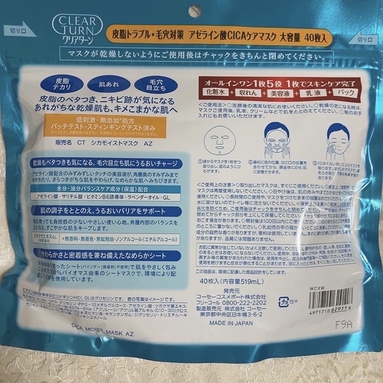 #PR#クリアターンコーセーコスメポート株式会社様より商品提供いただきました。クリアターンクリアターン アゼライン酸CICAケアマスクは、40枚入り♪液もヒタヒタで、シートが肌にフィットしてくれるのが良いですねべたつきはなく、さっぱりとした使...