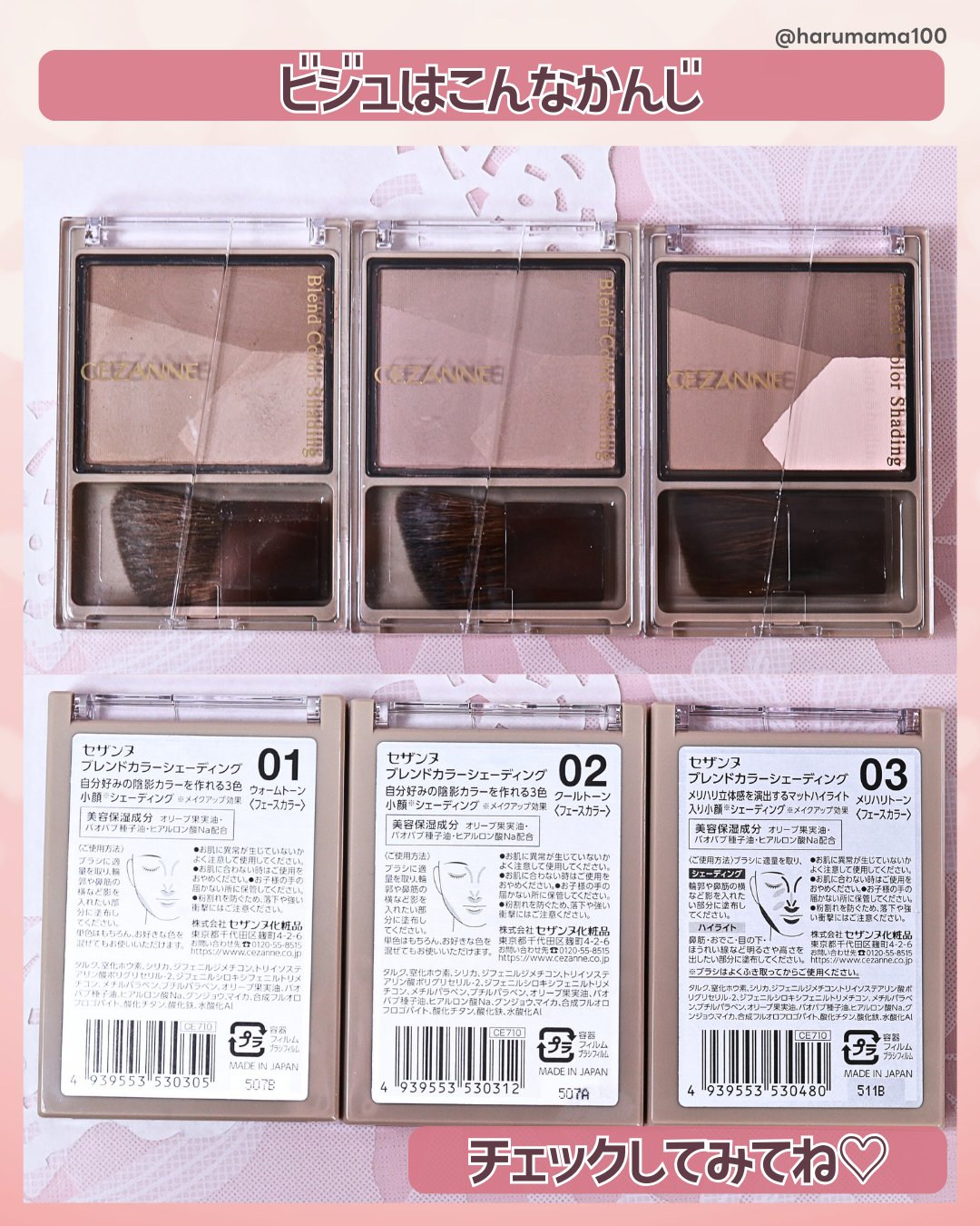 - <01 ウォームトーン> タルク、窒化ホウ素、シリカ、ジフェニルジメチコン、トリイソステアリン酸ポリグリセリル-2、ジフェニルシロキシフェニルトリメチコン、メチルパラベン、ブチルパラベン、オリーブ果実油、バオバブ種子油、ヒアルロン酸Na、グンジョウ、マイカ、合成フルオロフロゴパイト、酸化チタン、酸化鉄、水酸化Al <02 クールトーン> タルク、窒化ホウ素、シリカ、ジフェニルジメチコン、トリイソステアリン酸ポリグリセリル-2、ジフェニルシロキシフェニルトリメチコン、メチルパラベン、ブチルパラベン、オリーブ果実油、バオバブ種子油、ヒアルロン酸Na、グンジョウ、マイカ、合成フルオロフロゴパイト、酸化チタン、酸化鉄、水酸化Al