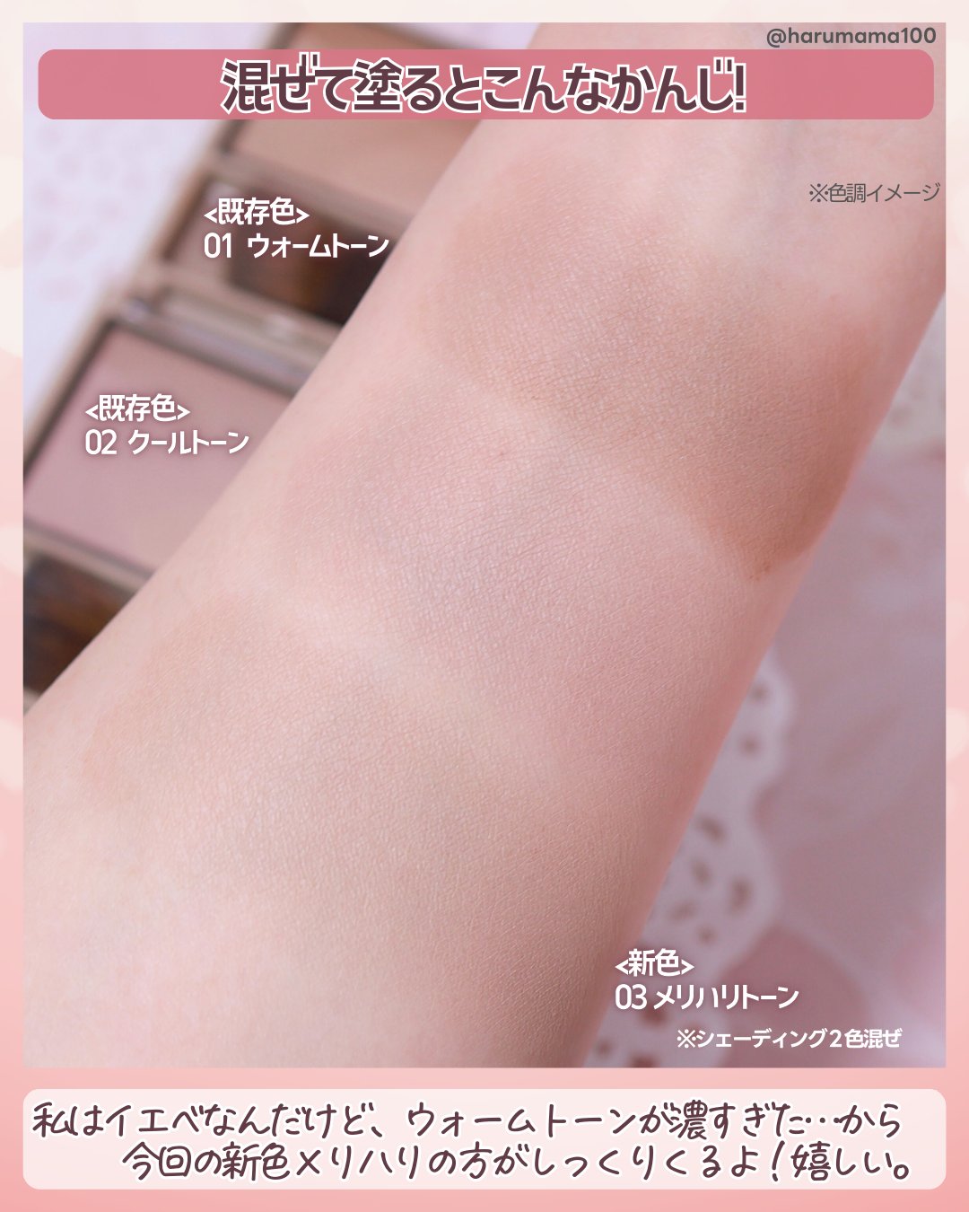 新色の「23 キューピッドピンク」は白みピンクの儚げな血色感で、透けるような奥行きとふんわり温かい雰囲気がかわいい〜♪ ミルキーカラーのリップとも相性が良いから出番が増えそう💕 テクスチャーはしっとりしていてグラデにしやすいし、なじませるとサラサラに変化するから、ベタつかずに使えた!