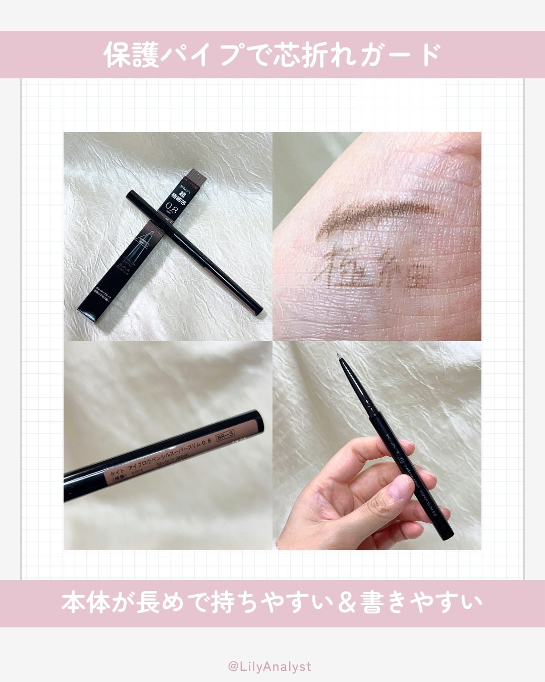 - まるでシャーペンで描くようなリアルな毛流れ眉が完成。 折れにくい 0.8mmの超極細芯。 #眉シャーペン ●直径0.8mmの極細芯により、眉尻の細かい部分や隙間埋めなど眉の一本一本まで繊細リアルに描ける ●上下に動く保護パイプつきだから、超極細芯でも折れにくい! ●汗・水、皮脂・こすれに強く、描いた眉をきれいにキープ