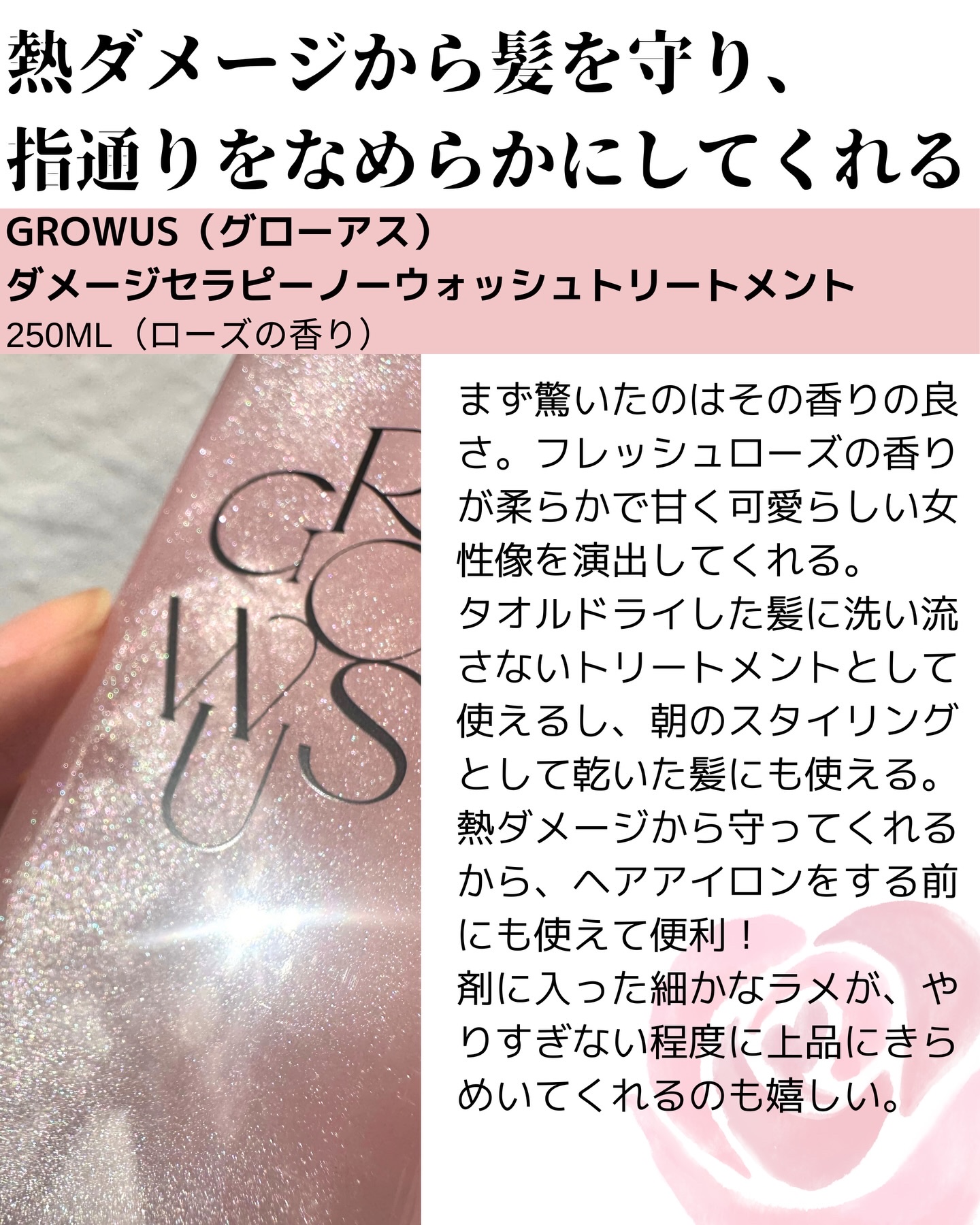 \きらめきヘア💞💞/GROWUSダメージセラピーノーウォッシュトリートメント250mLビジュアルがもうかわいすぎ!!!スプレータイプの洗い流さないトリートメント✨パールのきらめきと優雅な香りが特徴♡🌹ローズムスクの香り🌹ブラックカラントの甘さ...