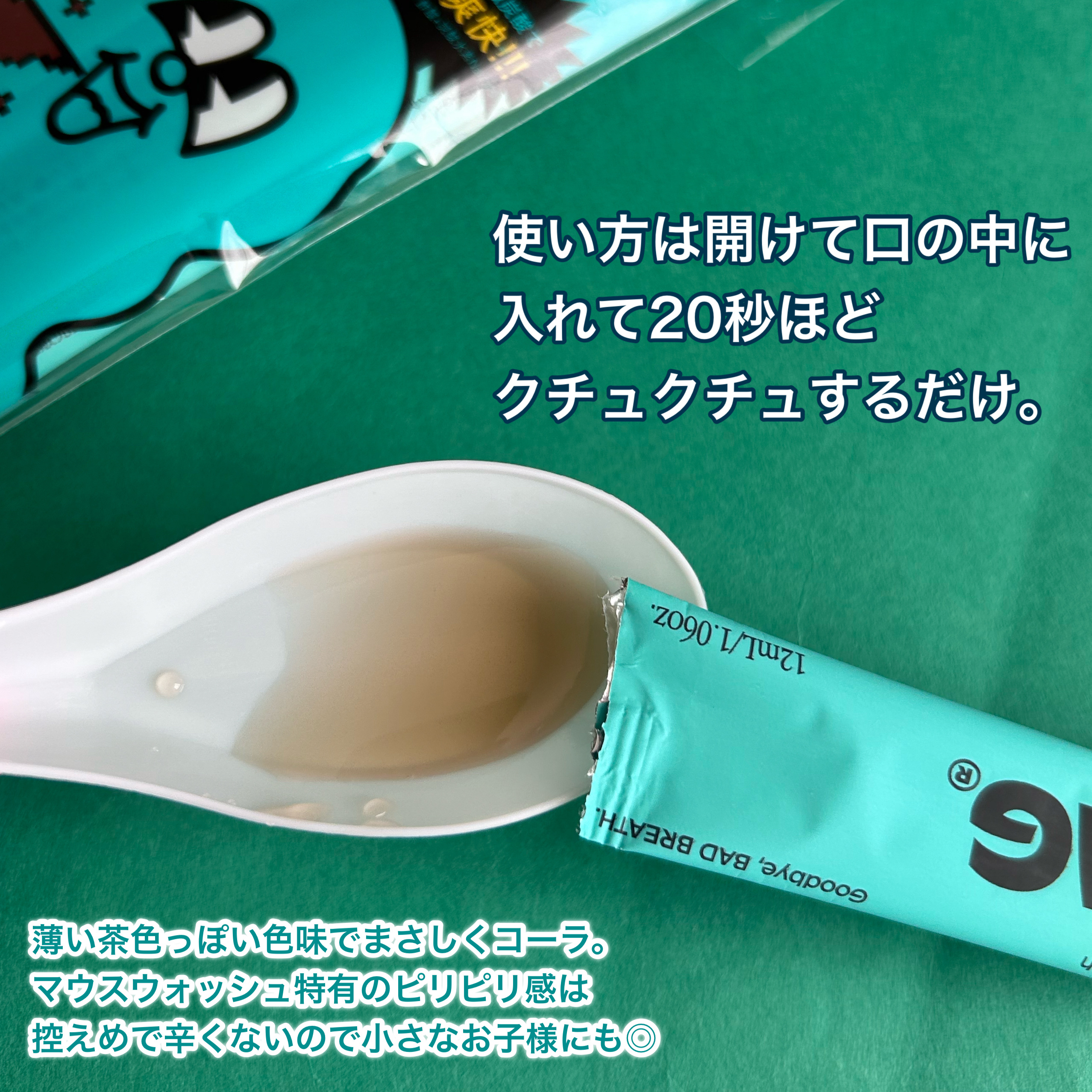 - これまでのマウスウォッシュの概念に遊び心をプラスしたフレーバータイプ。コーラ風味の爽快感が口いっぱいに広がり、毎日のオーラルケアをエンタメ感覚で取り入れられます。 さらに、すすいだ後の“汚れが見える”仕様でケアの実感を得やすく、続けやすい設計に。冷蔵庫で冷やしてから使えば「美味しいマウスウォッシュ*」として一層爽快に楽しめます。 ・使用方法:封を切って1包分(12ml)を口に含み、20秒ほどゆすいでから吐き出してください。使用後、汚れ残りが気になる方は水ですすいでください。※開封時に中身が飛び出ることがありますのでご注意ください。 ・注意事項:内服液ではありませんので、飲まないでください。口中の異常、発疹等のアレルギー、ぜんそく等の症状があらわれたり、異常を感じた場合は使用を中止し医師に相談してください。乳幼児の手の届かない所に保管してください。 *飲み物ではありません 一部店舗では9月上旬から販売開始。