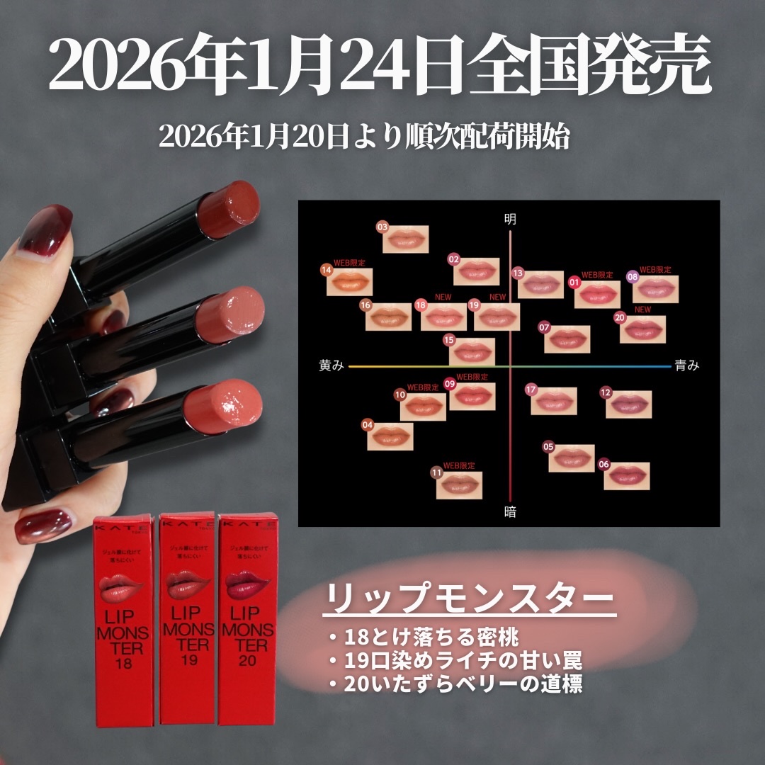 リップモンスターの新作!KATE#リップモンスター18とろけ落ちる蜜桃19口染めライチの甘い罠20いたずらベリーの道標新色は甘い果実のようなニュアンスピンク系!コーラルピンク系が好みのかたには18、ピンクベージュ系が好みのかたには19...