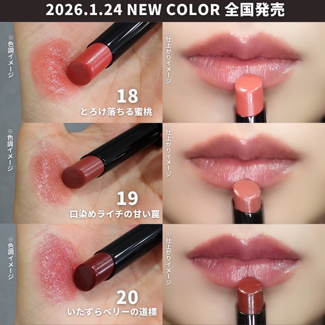 - <01 欲望の塊> テトライソステアリン酸ジペンタエリスリチル、トリ(カプリル酸/カプリン酸)グリセリル、オクチルドデカノール、ラウロイルグルタミン酸ジ(フィトステリル/オクチルドデシル)、ビスアルキル(C16-18)グリセリルウンデシルジメチコン、イソノナン酸イソトリデシル、水添ポリイソブテン、ラウロイルグルタミン酸ジ(オクチルドデシル/フィトステリル/ベヘニル)、パラフィン、合成ワックス、ダイマージリノール酸(フィトステリル/イソステアリル/セチル/ステアリル/ベヘニル)、マイクロクリスタリンワックス、水添マイクロクリスタリンワックス、ヒドロキシステアリン酸エチルヘキシル、トコフェロール、ホホバ種子油、オリーブ果実油、アーモンド油、(エチレン/プロピレン)コポリマー、ポリエチレン、ジメチコン、(+/-)(チタン/酸化チタン)焼結物、マイカ、ラウロイルアスパラギン酸Na、ラウロイルリシン、塩化亜鉛、酸化チタン、酸化鉄、水酸化Al、硫酸Ba、トリイソステアリン酸イソプロピルチタン、酸化スズ、ホウケイ酸(Ca/Al)、合成フルオロフロゴパイト、黄4、黄5、赤104(1)、赤201、赤202 <02 ピンクバナナ> テトライソステアリン酸ジペンタエリスリチル、トリ(カプリル酸/カプリン酸)グリセリル、オクチルドデカノール、ラウロイルグルタミン酸ジ(フィトステリル/オクチルドデシル)、ビスアルキル(C16-18)グリセリルウンデシルジメチコン、イソノナン酸イソトリデシル、水添ポリイソブテン、ラウロイルグルタミン酸ジ(オクチルドデシル/フィトステリル/ベヘニル)、パラフィン、合成ワックス、ダイマージリノール酸(フィトステリル/イソステアリル/セチル/ステアリル/ベヘニル)、マイクロクリスタリンワックス、水添マイクロクリスタリンワックス、ヒドロキシステアリン酸エチルヘキシル、トコフェロール、ホホバ種子油、オリーブ果実油、アーモンド油、(エチレン/プロピレン)コポリマー、ポリエチレン、ジメチコン、(+/-)(チタン/酸化チタン)焼結物、マイカ、ラウロイルアスパラギン酸Na、ラウロイルリシン、塩化亜鉛、酸化チタン、酸化鉄、水酸化Al、硫酸Ba、トリイソステアリン酸イソプロピルチタン、酸化スズ、ホウケイ酸(Ca/Al)、合成フルオロフロゴパイト、黄4、黄5、赤104(1)、赤201、赤202 <03 陽炎> テトライソステアリン酸ジペンタエリスリチル、トリ(カプリル酸/カプリン酸)グリセリル、オクチルドデカノール、ラウロイルグルタミン酸ジ(フィトステリル/オクチルドデシル)、ビスアルキル(C16-18)グリセリルウンデシルジメチコン、イソノナン酸イソトリデシル、水添ポリイソブテン、ラウロイルグルタミン酸ジ(オクチルドデシル/フィトステリル/ベヘニル)、パラフィン、合成ワックス、ダイマージリノール酸(フィトステリル/イソステアリル/セチル/ステアリル/ベヘニル)、マイクロクリスタリンワックス、水添マイクロクリスタリンワックス、ヒドロキシステアリン酸エチルヘキシル、トコフェロール、ホホバ種子油、オリーブ果実油、アーモンド油、(エチレン/プロピレン)コポリマー、ポリエチレン、ジメチコン、(+/-)(チタン/酸化チタン)焼結物、マイカ、ラウロイルアスパラギン酸Na、ラウロイルリシン、塩化亜鉛、酸化チタン、酸化鉄、水酸化Al、硫酸Ba、トリイソステアリン酸イソプロピルチタン、酸化スズ、ホウケイ酸(Ca/Al)、合成フルオロフロゴパイト、黄4、黄5、赤104(1)、赤201、赤202 <04 パンプキンワイン> テトライソステアリン酸ジペンタエリスリチル、トリ(カプリル酸/カプリン酸)グリセリル、オクチルドデカノール、ラウロイルグルタミン酸ジ(フィトステリル/オクチルドデシル)、ビスアルキル(C16-18)グリセリルウンデシルジメチコン、イソノナン酸イソトリデシル、水添ポリイソブテン、ラウロイルグルタミン酸ジ(オクチルドデシル/フィトステリル/ベヘニル)、パラフィン、合成ワックス、ダイマージリノール酸(フィトステリル/イソステアリル/セチル/ステアリル/ベヘニル)、マイクロクリスタリンワックス、水添マイクロクリスタリンワックス、ヒドロキシステアリン酸エチルヘキシル、トコフェロール、ホホバ種子油、オリーブ果実油、アーモンド油、(エチレン/プロピレン)コポリマー、ポリエチレン、ジメチコン、(+/-)(チタン/酸化チタン)焼結物、マイカ、ラウロイルアスパラギン酸Na、ラウロイルリシン、塩化亜鉛、酸化チタン、酸化鉄、水酸化Al、硫酸Ba、トリイソステアリン酸イソプロピルチタン、酸化スズ、ホウケイ酸(Ca/Al)、合成フルオロフロゴパイト、黄4、黄5、赤104(1)、赤201、赤202 <05 ダークフィグ> テトライソステアリン酸ジペンタエリスリチル、トリ(カプリル酸/カプリン酸)グリセリル、オクチルドデカノール、ラウロイルグルタミン酸ジ(フィトステリル/オクチルドデシル)、ビスアルキル(C16-18)グリセリルウンデシルジメチコン、イソノナン酸イソトリデシル、水添ポリイソブテン、ラウロイルグルタミン酸ジ(オクチルドデシル/フィトステリル/ベヘニル)、