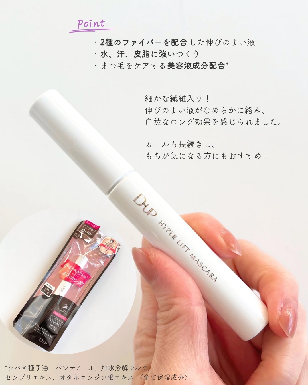 - 2024年10月1日より全国のバラエティショップ、ドラッグストア、公式オンラインショップ(https://store.d-up.co.jp/)にて発売いたします。 『ハイパーリフトマスカラ』は、“カールマスカラで本気のロング”をコンセプトに、ディーアップ史上最強のカールキープ力と驚きの長さを追求した新しいマスカラです。 ■カールキープ力とロング感の両立 カールキープ力の高いマスカラは、通常ワックスや被膜材でカールをキープしますが、同時に「ロング感」や「ダマの無い仕上がり」を両立させることは難しいとされてきました。ハイパーリフトマスカラは、あと1㎜長く、もっとなめらかにするための改良を重ね、「カールキープ力」と「ロング」どちらも限界レベルまで欲張った新処方です。 ■1㎜でも長く!「すご伸びカール」 ロングの秘密は、なめらかで“伸び感”のあるカール液。ファイバーを包み込みながら素早く毛先まで絡み、美しくスッと長いまつげを実現します。 さらに長さを出すため「まつげの根元」にも着目し、生え際から持ち上げて伸ばす、コンパクトなリフトアップカールブラシを新たに採用しました。 『ハイパーリフトマスカラ』で、想像を超える“新次元の上向きまつげ”を体験してください。