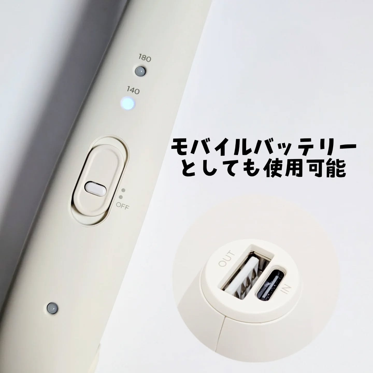 - スリムクッションプレート 髪に隙間なく密着するクッションプレートを採用。 スタイリングしやすく、毛先のニュアンス作りに最適。 充電式コードレス 外出先で手軽につかえるコードレスヘアアイロン。 前髪、顔周りのお直しに。本体側USB Type-C。 機内持ち込みOK 航空機内にはバッテリーを本体から外して手荷物として持ち込み可能。 立ち上がり時間 電源を入れてから約60秒※の素早い立ち上がりで、スピーディーにスタイリングが可能。 ※100℃に到達するまでの時間/180℃設定時 モバイルバッテリー機能 コードレスヘアアイロンとモバイルバッテリーの2in1。 スマートフォンを充電可能。 MOBILE BATTERY HAIR IRON 2in1 スマートフォンを充電可能(3400mAh)