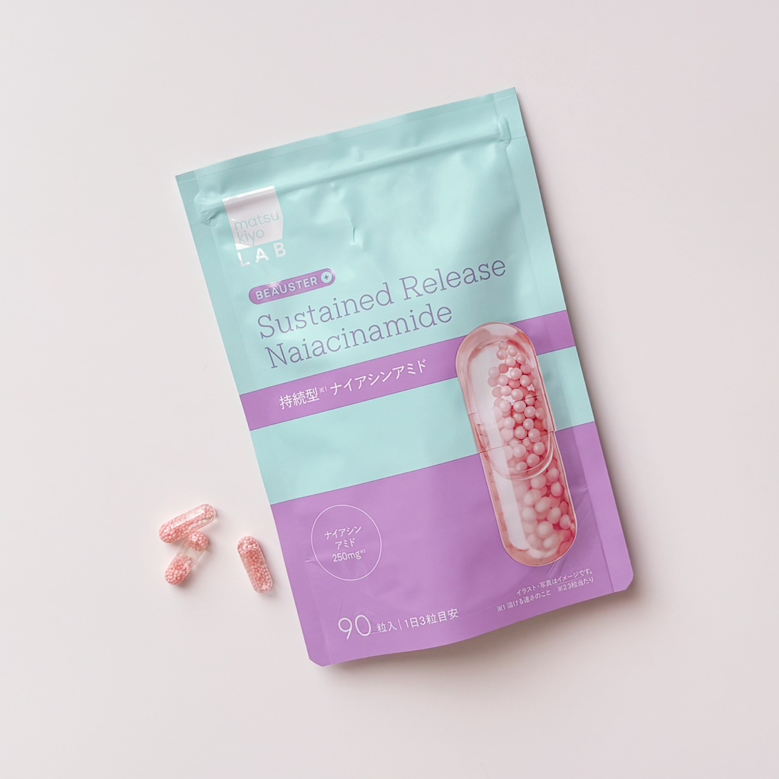- ビタミンB 群の1種である、水溶性のナイアシンアミドを250mg配合。 オイルin ビーズカプセルによる持続性が特長です。