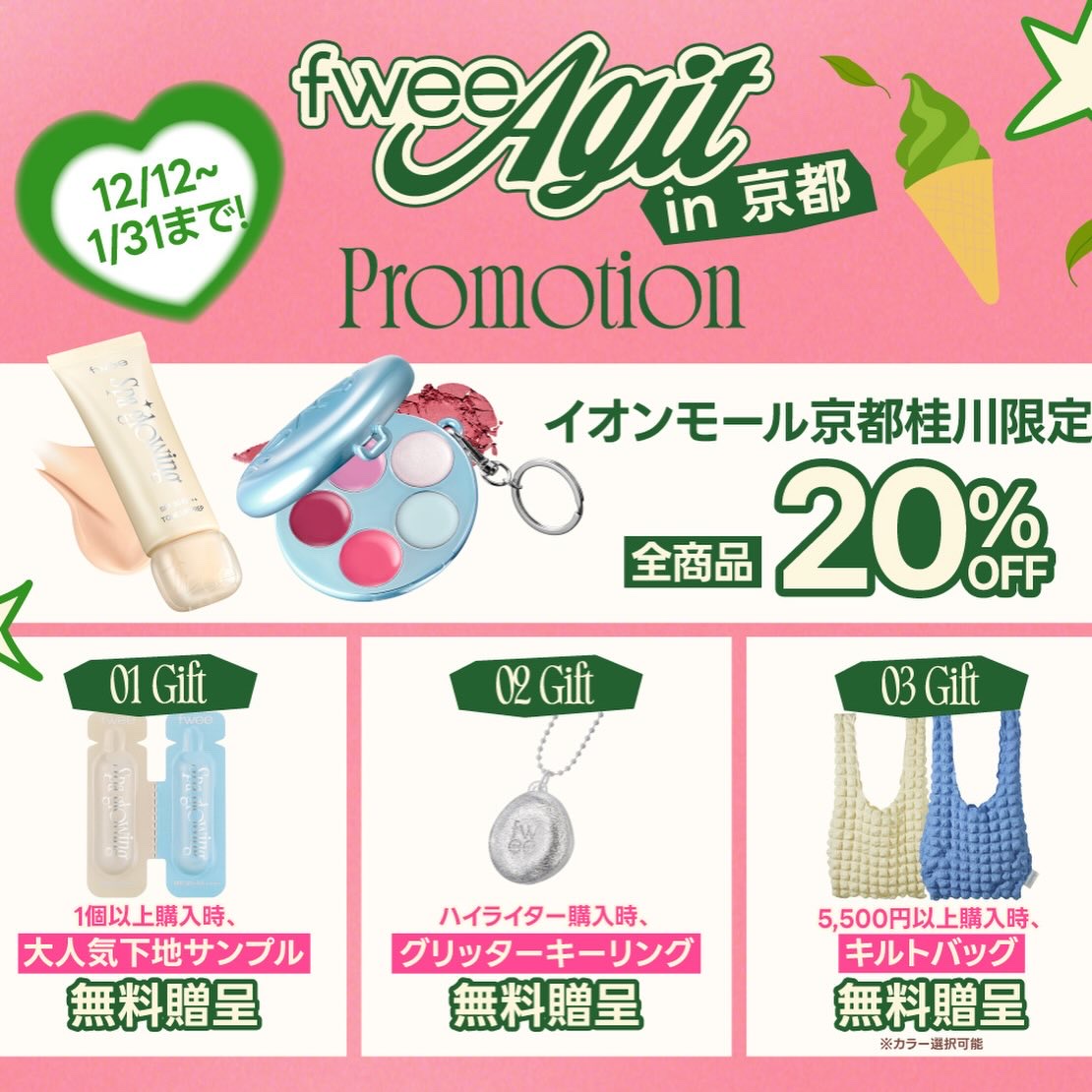 12/12(金)フィーアジト京都がついにオープン🌟私も愛用してるfwee下地やクッションファンデ、今話題のDIYパレット、その他全商品なんと20%OFF😳‼️しかもジェリーポット購入時、京都限定の抹茶キーリングが貰えちゃうよ🍵数量限定&超お得...