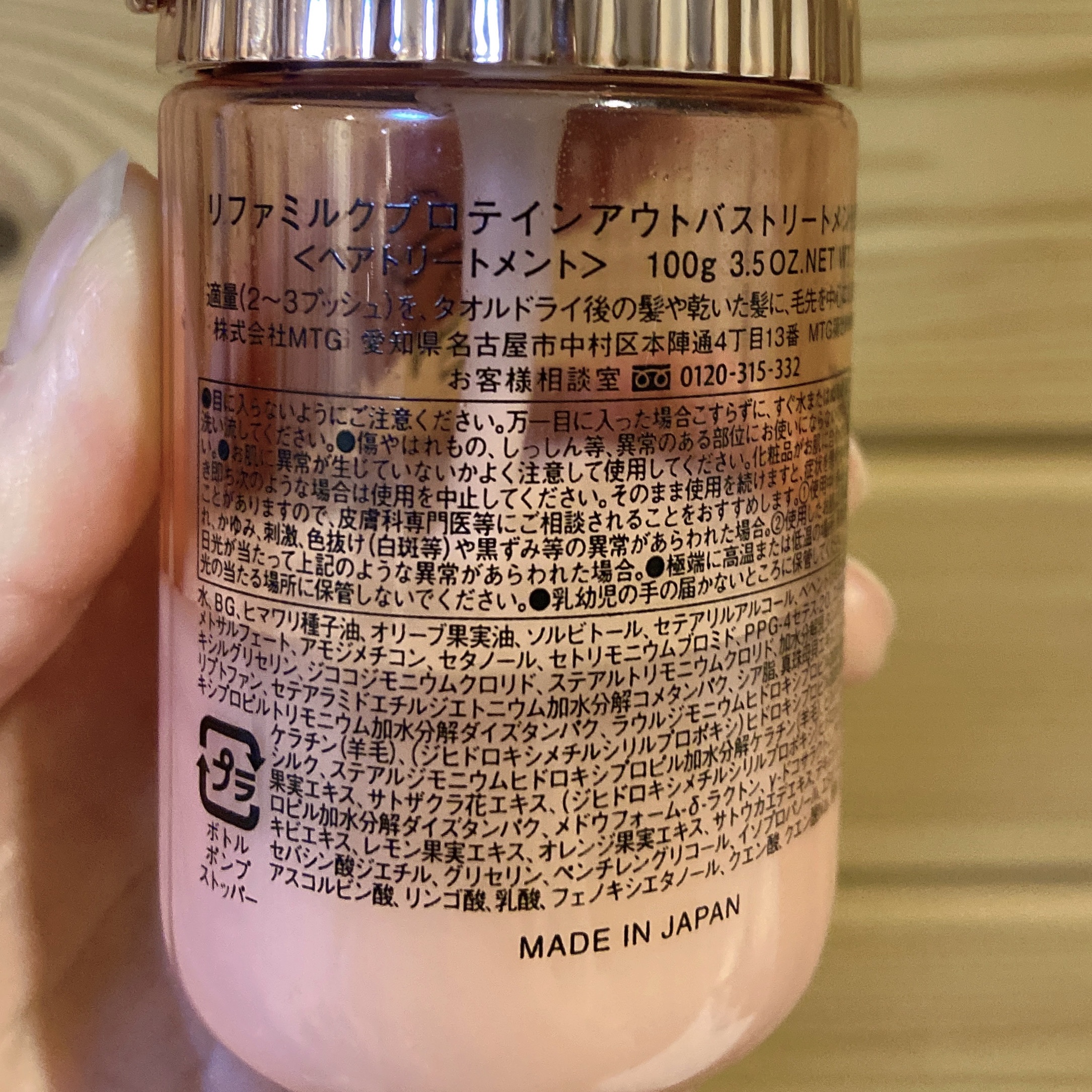 - <リファミルクプロテインアウトバストリートメントピンク> 水、BG、ヒマワリ種子油、オリーブ果実油、ソルビトール、セテアリルアルコール、ベヘントリモニウムメトサルフェート、アモジメチコン、セタノール、セトリモニウムブロミド、PPG-4セテス-20、エチルヘキシルグリセリン、ジココジモニウムクロリド、ステアルトリモニウムクロリド、加水分解乳タンパク、トリプトファン、セテアラミドエチルジエトニウム加水分解コメタンパク、シア脂、真珠母貝エキス、ヒドロキシプロピルトリモニウム加水分解ダイズタンパク、ラウルジモニウムヒドロキシプロピル加水分解ケラチン(羊毛)、(ジヒドロキシメチルシリルプロポキシ)ヒドロキシプロピル加水分解シルク、ステアルジモニウムヒドロキシプロピル加水分解ケラチン(羊毛)、ビルベリー果実エキス、サトザクラ花エキス、(ジヒドロキシメチルシリルプロポキシ)ヒドロキシプロピル加水分解ダイズタンパク、メドウフォーム-δ-ラクトン、γ-ドコサラクトン、サトウキビエキス、レモン果実エキス、オレンジ果実エキス、サトウカエデエキス、デキストリン、セバシン酸ジエチル、グリセリン、ペンチレングリコール、イソプロパノール、エタノール、アスコルビン酸、リンゴ酸、乳酸、フェノキシエタノール、クエン酸、クエン酸Na、香料