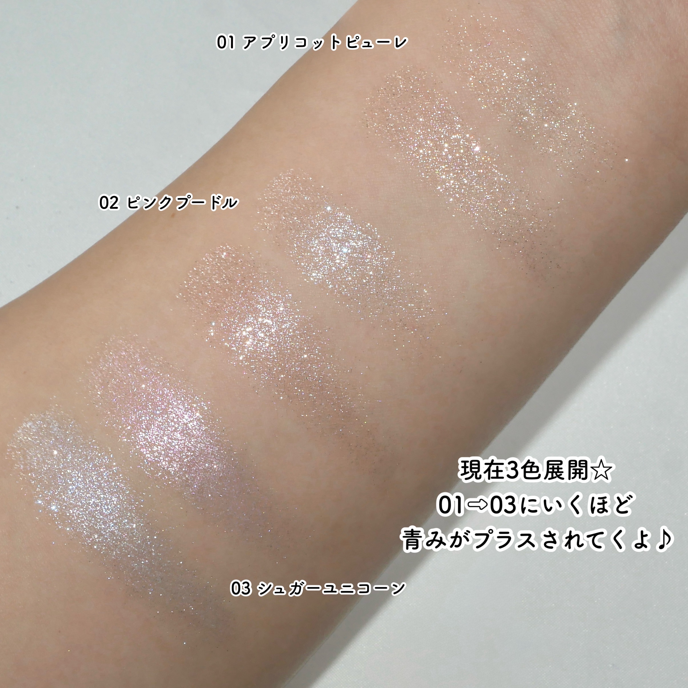 - <01 アプリコットピューレ> ジメチコン、タルク、合成フルオロフロゴパイト、イソステアリン酸水添ヒマシ油、ホウケイ酸(Ca/Al)、マイカ、酸化チタン、銀、シリカ、酸化鉄、メチルパラベン、ホウケイ酸(Ca/チタン)、赤226、酸化スズ、アルガニアスピノサ核油、カニナバラ果実油、トコフェロール、ヒアルロン酸Na <02 ピンクプードル> ジメチコン、タルク、合成フルオロフロゴパイト、イソステアリン酸水添ヒマシ油、ホウケイ酸(Ca/Al)、マイカ、酸化チタン、銀、メチルパラベン、酸化鉄、赤226、グンジョウ、酸化スズ、アルガニアスピノサ核油、カニナバラ果実油、トコフェロール、ヒアルロン酸Na、赤202