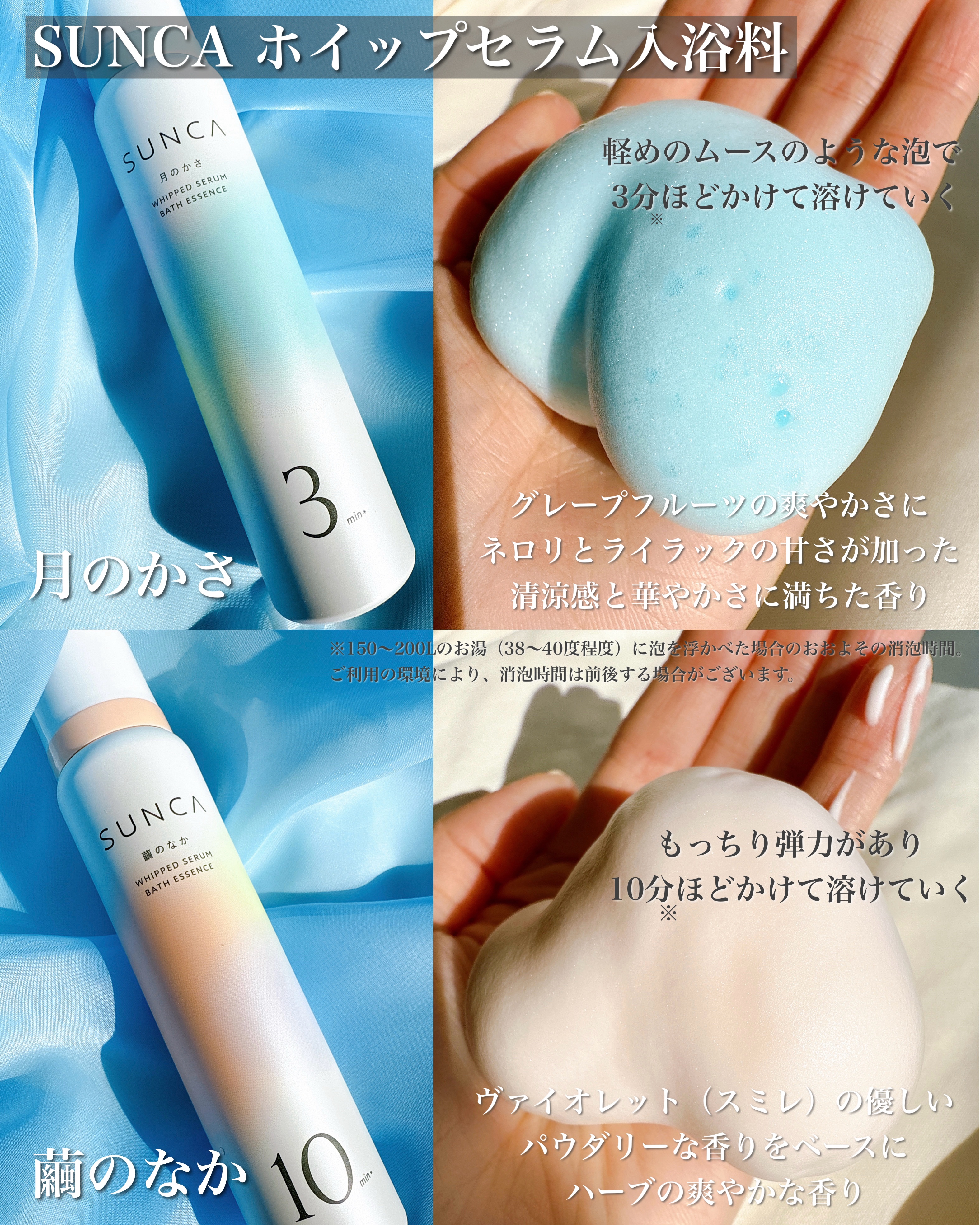 スキンケア入浴料知ってる?!繭のなか:濃厚でこっくりとした泡で10分くらい※1泡が浮かんでるからゆっくりとした時間を過ごせるよう♡安定型レチノール※2配合で、もっちりとしたハリのあるお肌になりたいときにおすすめ🫧月のかさ:3分くらい※1浮かぶ...