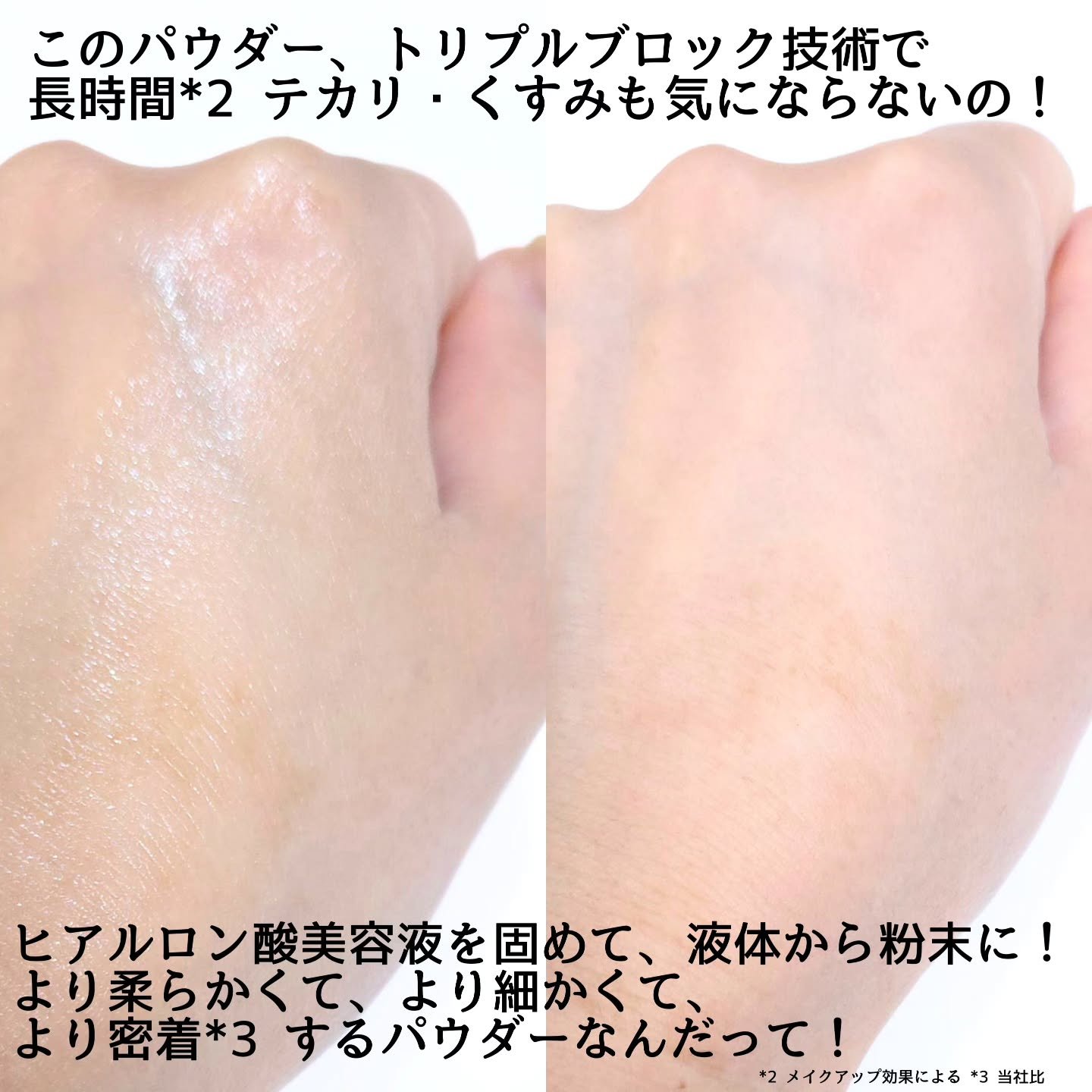 - もう粉で埋めない、「生肌パウダー」で呼吸する肌へ ヒアルロン酸配合の美容液パウダーが保湿しながらテカリ・くすみをカバーして、 24 時間*生美肌つづく。 <商品特性> ・[新感覚] 美容液生まれの「生パウダー」重ねても粉っぽさゼロを目指す 匕アル口ン酸美容液を固めて、液体から粉末に。より柔らかく、より細かく、より密着するパウダーで*、まるでクリームのようにとろける、新感覚のつけ心地。 *当社比 ・「トリプルブロック」技術、24時間*テカリ・くすみも気になりにくい 独自に開発したオイルコントロールファクターSmartLockBLUE**は、より的確に皮脂を吸着、よりしっかりテカリを抑え、より根本的に製品の酸化を防ぐ *** 。水分をたっぷり含んだハイドロゲル層で、肌本来の潤いをキープしながら、テカリとベースメイクの酸化によるくすみをブロック。 *自社調べ **フラーレン(製品の抗酸化剤)、ヒドロキシアパタイト(吸着) ***当社比 ・「360° 光拡散」透明感あふれる*、まるで発光肌 透明感あふれる*光反射粒子とソフトフォーカス粒子のW効果で、360°自然に光を反射。気になる毛穴や色ムラをカバーして、透明感のあるワントーン明るい肌*へ。 ・「くすみ補正」トーンアップブルーを採用し、ひと塗りでくすみをカバー 15万人のアジア人の肌色データを分析することで、日本人の肌に合った補正カラー「トーンアッププルー」を開発。くすみ部分をふわっと自然に飛ばして、明るく澄んだ肌印象に。 *メイクアップ効果による