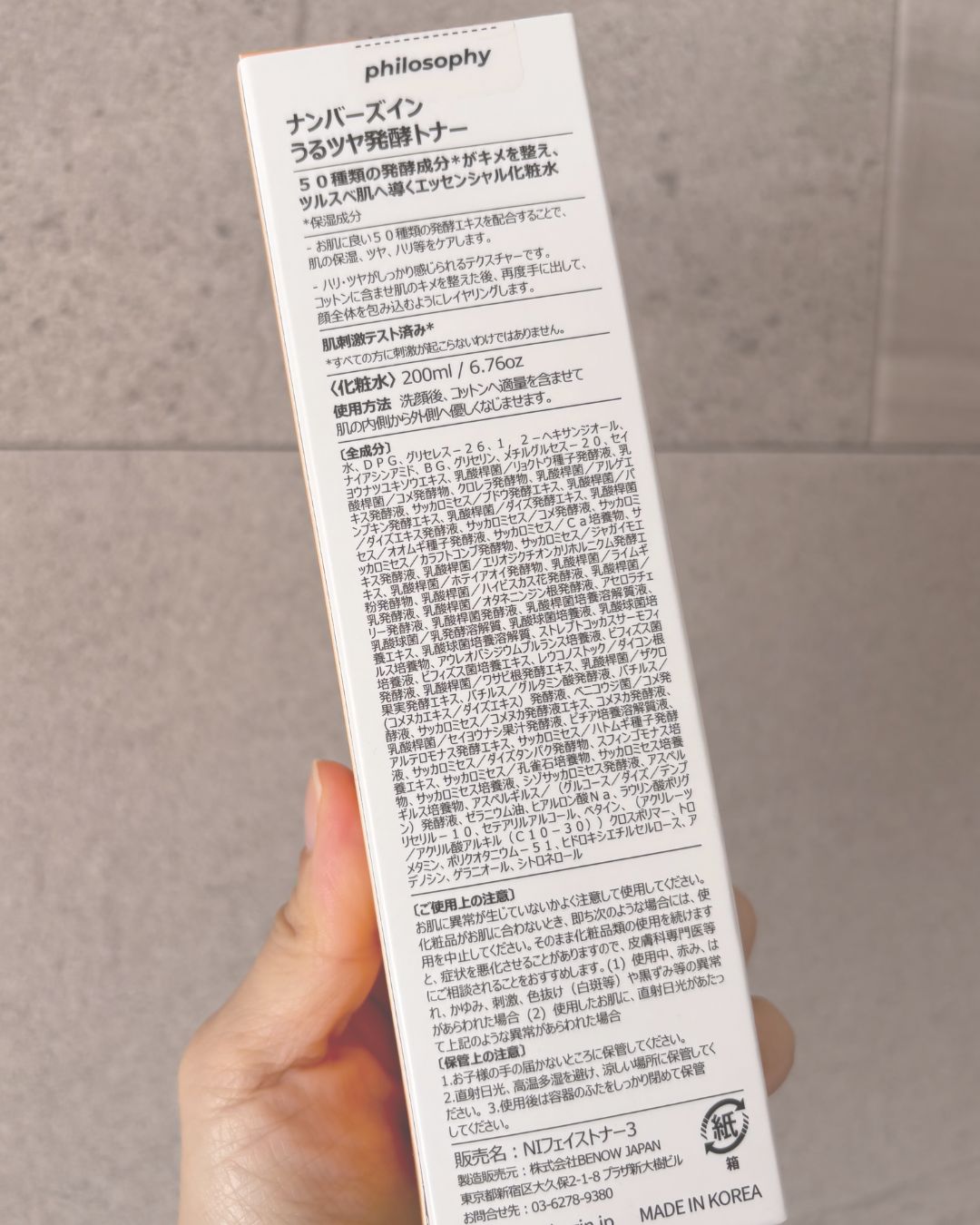 - <200ml> 水、DPG、グリセレス-26、1,2-ヘキサンジオール、ナイアシンアミド、BG、グリセリン、メチルグルセス-20、セイヨウナツユキソウエキス、乳酸桿菌/リョクトウ種子発酵液、乳酸桿菌/コメ発酵物、クロレラ発酵物、乳酸桿菌/アルゲエキス発酵液、サッカロミセス/ブドウ発酵エキス、乳酸桿菌/パンプキン発酵エキス、乳酸桿菌/ダイズ発酵エキス、乳酸桿菌/ダイズエキス発酵液、サッカロミセス/コメ発酵液、サッカロミセス/オオムギ種子発酵液、サッカロミセス/Ca培養物、サッカロミセス/カラフトコンブ発酵物、サッカロミセス/ジャガイモエキス発酵液、乳酸桿菌/エリオジクチオンカリホルニクム発酵エキス、乳酸桿菌/ホテイアオイ発酵物、乳酸桿菌/ライムギ粉発酵物、乳酸桿菌/ハイビスカス花発酵液、乳酸桿菌/乳発酵液、乳酸桿菌/オタネニンジン根発酵液、アセロラチェリー発酵液、乳酸桿菌発酵液、乳酸桿菌培養溶解質液、乳酸球菌/乳発酵溶解質、乳酸球菌培養液、乳酸球菌培養エキス、乳酸球菌培養溶解質、ストレプトコッカスサーモフィルス培養物、アウレオバシジウムプルランス培養液、ビフィズス菌培養液、ビフィズス菌培養エキス、レウコノストック/ダイコン根発酵液、乳酸桿菌/ワサビ根発酵エキス、乳酸桿菌/ザクロ果実発酵エキス、バチルス/グルタミン酸発酵液、バチルス/(コメヌカエキス/ダイズエキス)発酵液、ベニコウジ菌/コメ発酵液、サッカロミセス/コメヌカ発酵液エキス、コメヌカ発酵液、乳酸桿菌/セイヨウナシ果汁発酵液、ピチア培養溶解質液、アルテロモナス発酵エキス、サッカロミセス/ハトムギ種子発酵液、サッカロミセス/ダイズタンパク発酵物、スフィンゴモナス培養エキス、サッカロミセス/孔雀石培養物、サッカロミセス培養物、サッカロミセス培養液、シゾサッカロミセス発酵液、アスペルギルス培養物、アスペルギルス/(グルコース/ダイズ/デンプン)発酵液、ゼラニウム油、ヒアルロン酸Na、ラウリン酸ポリグリセリル-10、セテアリルアルコール、ベタイン、(アクリレーツ/アクリル酸アルキル(C10-30))クロスポリマー、トロメタミン、ポリクオタニウム-51、ヒドロキシエチルセルロース、アデノシン、ゲラニオール、シトロネロール