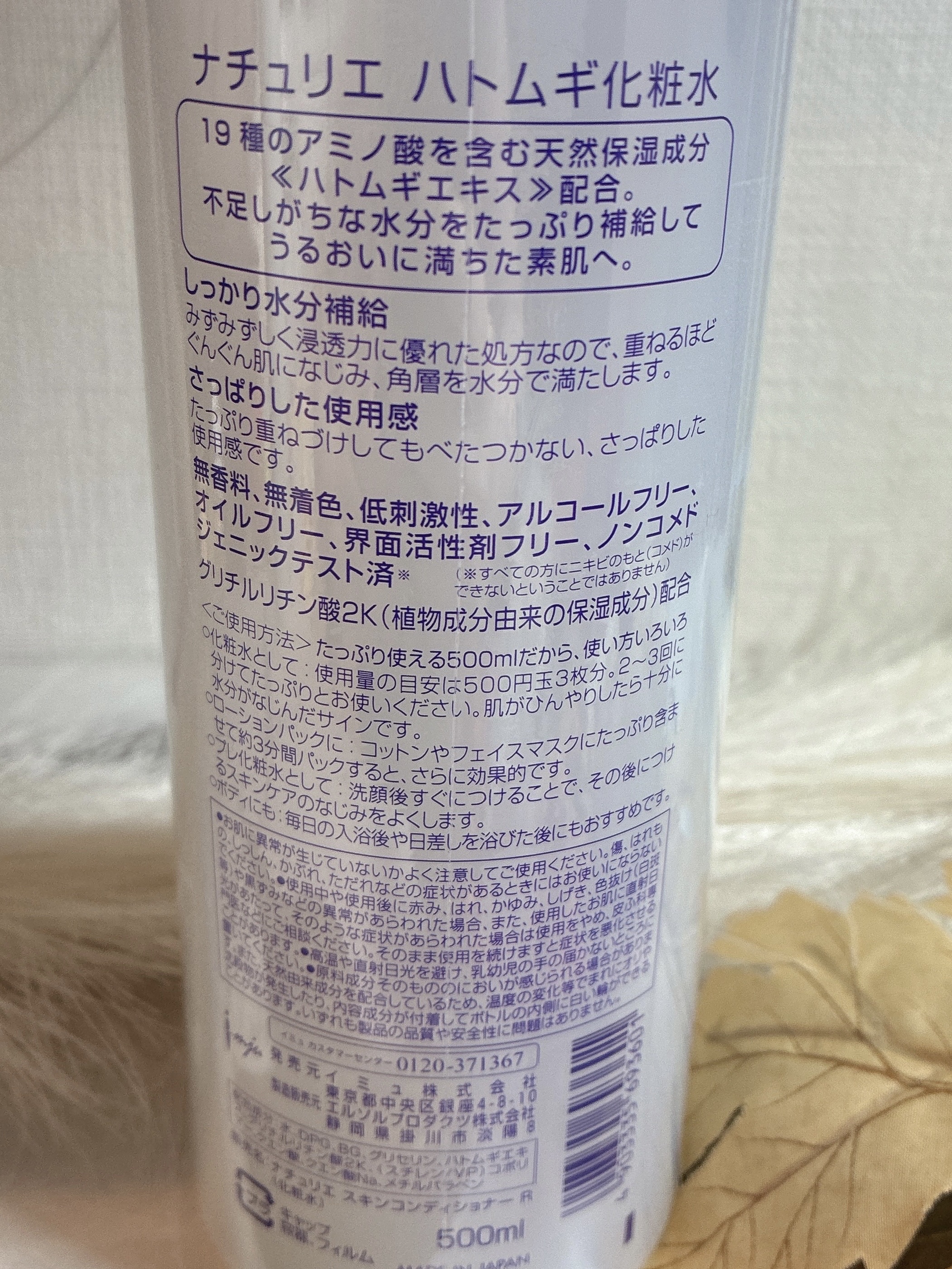 - <通常サイズ 500ml> 水、DPG、BG、グリセリン、ハトムギエキス、グリチルリチン酸2K、(スチレン/VP)コポリマー、クエン酸、クエン酸Na、メチルパラベン <500ml+ 限定ムーミンデザインボトル> 水、DPG、BG、グリセリン、ハトムギエキス、グリチルリチン酸2K、(スチレン/VP)コポリマー、クエン酸、クエン酸Na、メチルパラベン <詰め替えタイプ 480ml> 水、DPG、BG、グリセリン、ハトムギエキス、グリチルリチン酸2K、(スチレン/VP)コポリマー、クエン酸、クエン酸Na、メチルパラベン <旧製品> BG、グリセリン、メチルパラベン、エタノール、グリチルリチン酸2K、ハトムギエキス、DPG、クエン酸Na、プロピルパラベン、クエン酸、(スチレン/アクリレーツ)コポリマー、水 <限定ムーミンデザイン> 水、DPG、BG、グリセリン、ハトムギエキス、グリチルリチン酸2K、(スチレン/VP)コポリマー、クエン酸、クエン酸Na、メチルパラベン