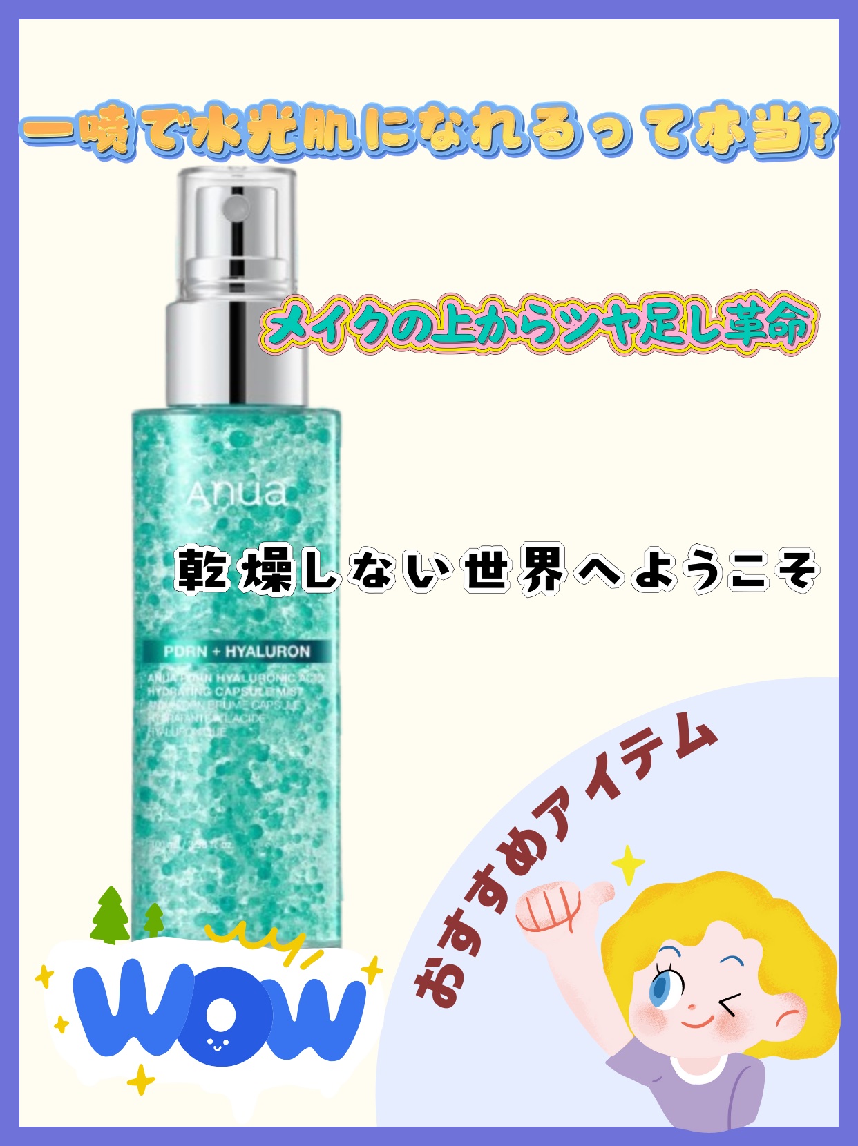 - 今回登場する「PDRNヒアルロン酸ハイドレイティングミスト」は、肌にうるおいやハリを与える「ヒアルロン酸*¹」「コラーゲン*²」「PDRN*³」を閉じ込めたANUA PDRN CAPSULE™配合の保湿ミストです。スプレーした瞬間に、エメラルド色のグロウオイルビーズが均一に広がり角質層のすみずみまで水分を満たし、うるおいによってツヤのある水光肌を演出します。 ①心地よいしっとり感を目指すレイヤリング処方 ウォータリーエッセンスとグロウオイルビーズを組み合わせ、軽やかな使い心地とうるおい感を両立。ヒアルロン酸*¹+コラーゲン*²+PDRN*³配合のANUA PDRN CAPSULE™が、ミストを振ることで肌の上でやさしくはじけて角質層までうるおいを届けます。 ②乾燥が気になる季節のうるおいケアに 季節の変わり目や冷暖房による乾燥環境でも、表面だけの保湿にとどまらず、肌の内側*4からしっとり感をキープ。乾燥によるくすみやごわつきをケアし、うるおいによる透明感のある肌へ。 ③メイク前後どちらも使えるスキンケアミスト メイク前後の保湿ケアとして活用可能。メイク前の使用ではキメを整えることでメイクノリをサポートし、メイク後の使用ではツヤ感をプラスし、メイクの仕上がりをサポートします。 ④年齢に応じたスキンケアのサポートにも PDRN*³を2000ppm配合し、うるおいとハリ感を同時にケア。乾燥による気になる目元・口元・首などへの使用もおすすめです。 *1 加水分解ヒアルロン酸(整肌成分) *2 加水分解コラーゲン(整肌成分) *3 DNA-Na(整肌成分) *4 角質層まで 2025年11月1日(土)よりQoo10メガポにて先行発売