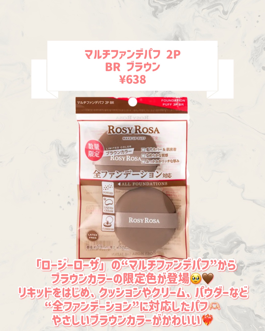 ロージーローザ新作情報⟡.·*.··············································⟡.·*.発売日202601/24ブラウンカラーの限定色が登場♥限定マルチファンデパフ2P638円♡限定色ブラウン温か...