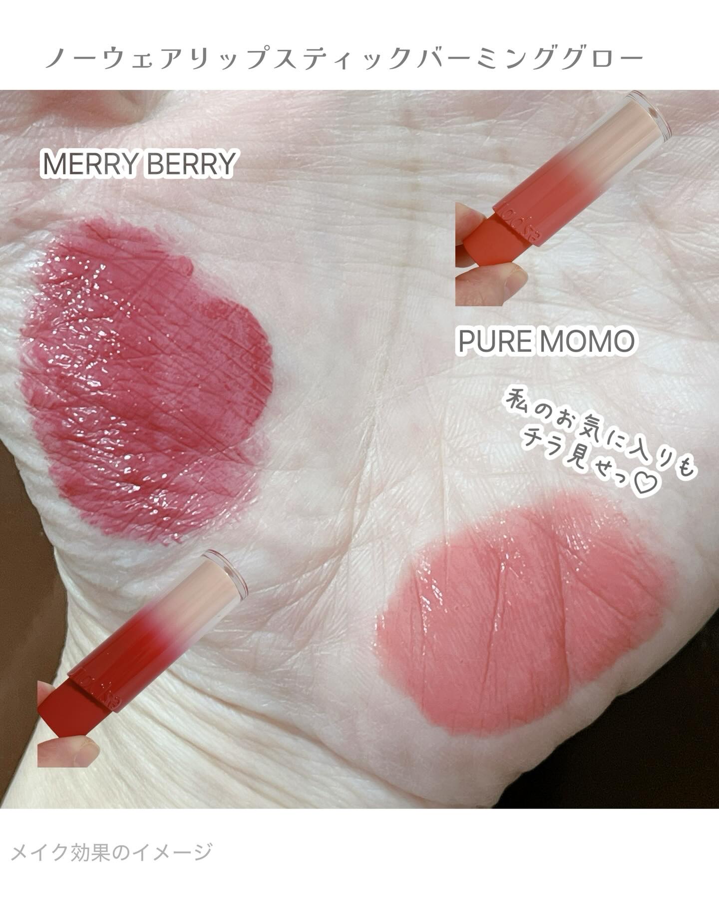 - <01 ヴィヴィディ(Vividy)【EC展開カラー】> ペンタイソステアリン酸ジペンタエリスリチル、トリ(カプリル酸/カプリン酸)グリセリル、ラウロイルグルタミン酸ジ(フィトステリル/オクチルドデシル)、オクチルドデカノール、グリセリルウンデシルジメチコン、ジフェニルジメチコン、合成ワックス、ダイマージリノール酸(フィトステリル/イソステアリル/セチル/ステアリル/ベヘニル)、トリイソステアリン酸ポリグリセリル-2、(アクリレーツ/アクリル酸ステアリル/メタクリル酸ジメチコン)コポリマー、ラウリルポリグリセリル-3ポリジメチルシロキシエチルジメチコン、(エチレン/プロピレン)コポリマー、ジメチコン、ポリヒドロキシステアリン酸、香料、レシチン、パルミチン酸エチルヘキシル、イソステアリン酸、ミリスチン酸イソプロピル、ポリリシノレイン酸ポリグリセリル-3、水酸化Al、トリエトキシカプリリルシラン、トコフェロール、赤226、黄5、赤104(1)、酸化チタン、赤201 <02 ベリーコア(Berry Core)> ペンタイソステアリン酸ジペンタエリスリチル、トリ(カプリル酸/カプリン酸)グリセリル、オクチルドデカノール、ラウロイルグルタミン酸ジ(フィトステリル/オクチルドデシル)、グリセリルウンデシルジメチコン、ジフェニルジメチコン、合成ワックス、ダイマージリノール酸(フィトステリル/イソステアリル/セチル/ステアリル/ベヘニル)、トリイソステアリン酸ポリグリセリル-2、(アクリレーツ/アクリル酸ステアリル/メタクリル酸ジメチコン)コポリマー、ラウリルポリグリセリル-3ポリジメチルシロキシエチルジメチコン、(エチレン/プロピレン)コポリマー、ジメチコン、香料、トコフェロール、赤202、赤201、黄5、酸化鉄 <03 クランベリー(Cranberry)【EC展開カラー】> ペンタイソステアリン酸ジペンタエリスリチル、オクチルドデカノール、トリ(カプリル酸/カプリン酸)グリセリル、ラウロイルグルタミン酸ジ(フィトステリル/オクチルドデシル)、グリセリルウンデシルジメチコン、ジフェニルジメチコン、合成ワックス、ダイマージリノール酸(フィトステリル/イソステアリル/セチル/ステアリル/ベヘニル)、トリイソステアリン酸ポリグリセリル-2、(アクリレーツ/アクリル酸ステアリル/メタクリル酸ジメチコン)コポリマー、ラウリルポリグリセリル-3ポリジメチルシロキシエチルジメチコン、(エチレン/プロピレン)コポリマー、ジメチコン、香料、リンゴ酸ジイソステアリル、トコフェロール、ポリヒドロキシステアリン酸、レシチン、トリエトキシカプリリルシラン、パルミチン酸エチルヘキシル、イソステアリン酸、ミリスチン酸イソプロピル、ポリリシノレイン酸ポリグリセリル-3、酸化鉄、黄5、赤202、赤230(1) <04 ヘイベスティ(Hey Bestie)【EC展開カラー】> ペンタイソステアリン酸ジペンタエリスリチル、トリ(カプリル酸/カプリン酸)グリセリル、ラウロイルグルタミン酸ジ(フィトステリル/オクチルドデシル)、オクチルドデカノール、ジフェニルジメチコン、グリセリルウンデシルジメチコン、合成ワックス、ダイマージリノール酸(フィトステリル/イソステアリル/セチル/ステアリル/ベヘニル)、トリイソステアリン酸ポリグリセリル-2、ラウリルポリグリセリル-3ポリジメチルシロキシエチルジメチコン、(アクリレーツ/アクリル酸ステアリル/メタクリル酸ジメチコン)コポリマー、ポリヒドロキシステアリン酸、(エチレン/プロピレン)コポリマー、ジメチコン、レシチン、香料、パルミチン酸エチルヘキシル、イソステアリン酸、ミリスチン酸イソプロピル、ポリリシノレイン酸ポリグリセリル-3、水酸化Al、トリエトキシカプリリルシラン、トコフェロール、酸化チタン、赤202、黄5、赤104(1)、酸化鉄、青1 <05 ブルーベリー(Blueberry)> ペンタイソステアリン酸ジペンタエリスリチル、トリ(カプリル酸/カプリン酸)グリセリル、ラウロイルグルタミン酸ジ(フィトステリル/オクチルドデシル)、オクチルドデカノール、グリセリルウンデシルジメチコン、ジフェニルジメチコン、合成ワックス、ダイマージリノール酸(フィトステリル/イソステアリル/セチル/ステアリル/ベヘニル)、トリイソステアリン酸ポリグリセリル-2、ラウリルポリグリセリル-3ポリジメチルシロキシエチルジメチコン、(アクリレーツ/アクリル酸ステアリル/メタクリル酸ジメチコン)コポリマー、(エチレン/プロピレン)コポリマー、ジメチコン、香料、水酸化Al、トリエトキシカプリリルシラン、トコフェロール、酸化チタン、酸化鉄、赤202、青1、赤104(1) <06 ニューローズ(New Rose)> ペンタイソステアリン酸ジペンタエリスリチル、トリ(カプリル酸/カプリン酸)グリセリル、ラウロイルグルタミン酸ジ(フィトステリル/オクチルドデシル)、オクチルドデカノール、ジフェニルジメチコン、グリセリルウンデシルジメチコン、合成ワックス、ダイマージリノール酸(フィトステリル/イソステアリル/セチル/ステアリル/ベヘニル)、トリイソステアリン酸ポリグリ