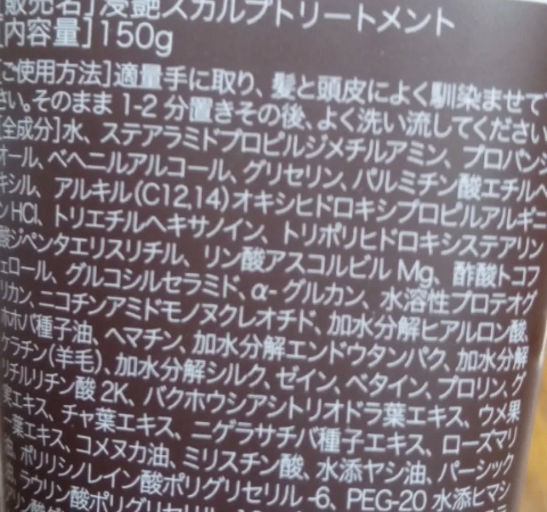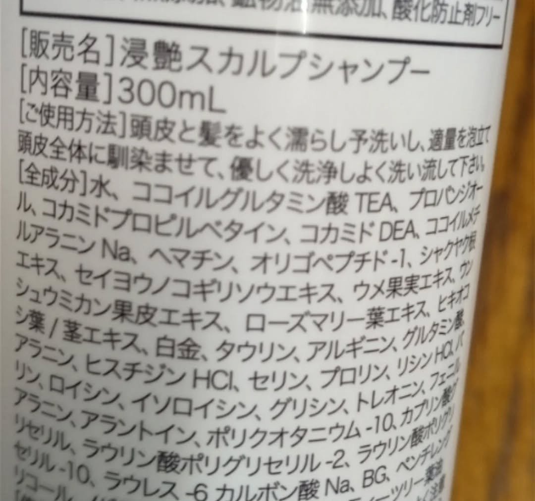 - <浸艶スカルプシャンプー> 水、ココイルグルタミン酸TEA、プロパンジオール、コカミドプロピルベタイン、コカミドDEA、ココイルメチルアラニンNa、ヘマチン、オリゴペプチド-1、シャクヤク根エキス、セイヨウノコギリソウエキス、ウメ果実エキス、ウンシュウミカン果皮エキス、ローズマリー葉エキス、ヒキオコシ葉/茎エキス、白金、タウリン、アルギニン、グルタミン酸、アラニン、ヒスチジンHCl、セリン、プロリン、リシンHCl、バリン、ロイシン、イソロイシン、グリシン、トレオニン、フェニルアラニン、アラントイン、ポリクオタニウム-10、カプリン酸グリセリル、ラウリン酸ポリグリセリル-2、ラウリン酸ポリグリセリル-10、ラウレス-6カルボン酸Na、BG、ペンチレングリコール、ノバラ油、ローズマリー葉油、ティーツリー葉油 <浸艶スカルプトリートメント> 水、ステアラミドプロピルジメチルアミン、プロパンジオール、ベヘニルアルコール、グリセリン、パルミチン酸エチルヘキシル、アルキル(C12,14)オキシヒドロキシプロピルアルギニンHCl、トリエチルヘキサノイン、トリポリヒドロキシステアリン酸ジペンタエリスリチル、リン酸アスコルビルMg、酢酸トコフェロール、グルコシルセラミド、α−グルカン、水溶性プロテオグリカン、ニコチンアミドモノヌクレオチド、加水分解ヒアルロン酸、ホホバ種子油、ヘマチン、加水分解エンドウタンパク、加水分解ケラチン(羊毛)、加水分解シルク、ゼイン、ベタイン、プロリン、グリチルリチン酸2K、バクホウシアシトリオドラ葉エキス、ウメ果実エキス、チャ葉エキス、ニゲラサチバ種子エキス、ローズマリー葉エキス、コメヌカ油、ミリスチン酸、水添ヤシ油、パーシック油、ポリリシノレイン酸ポリグリセリル-6、PEG-20水添ヒマシ油、ラウリン酸ポリグリセリル-10、ポリクオタニウム-10、ステアリン酸グリセリル、カプリン酸グリセリル、ラウリン酸ポリグリセリル-2、オレイン酸ソルビタン、ペンチレングリコール、エタノール、BG、ラベンダー油、オレンジ油、アオモジ果実油