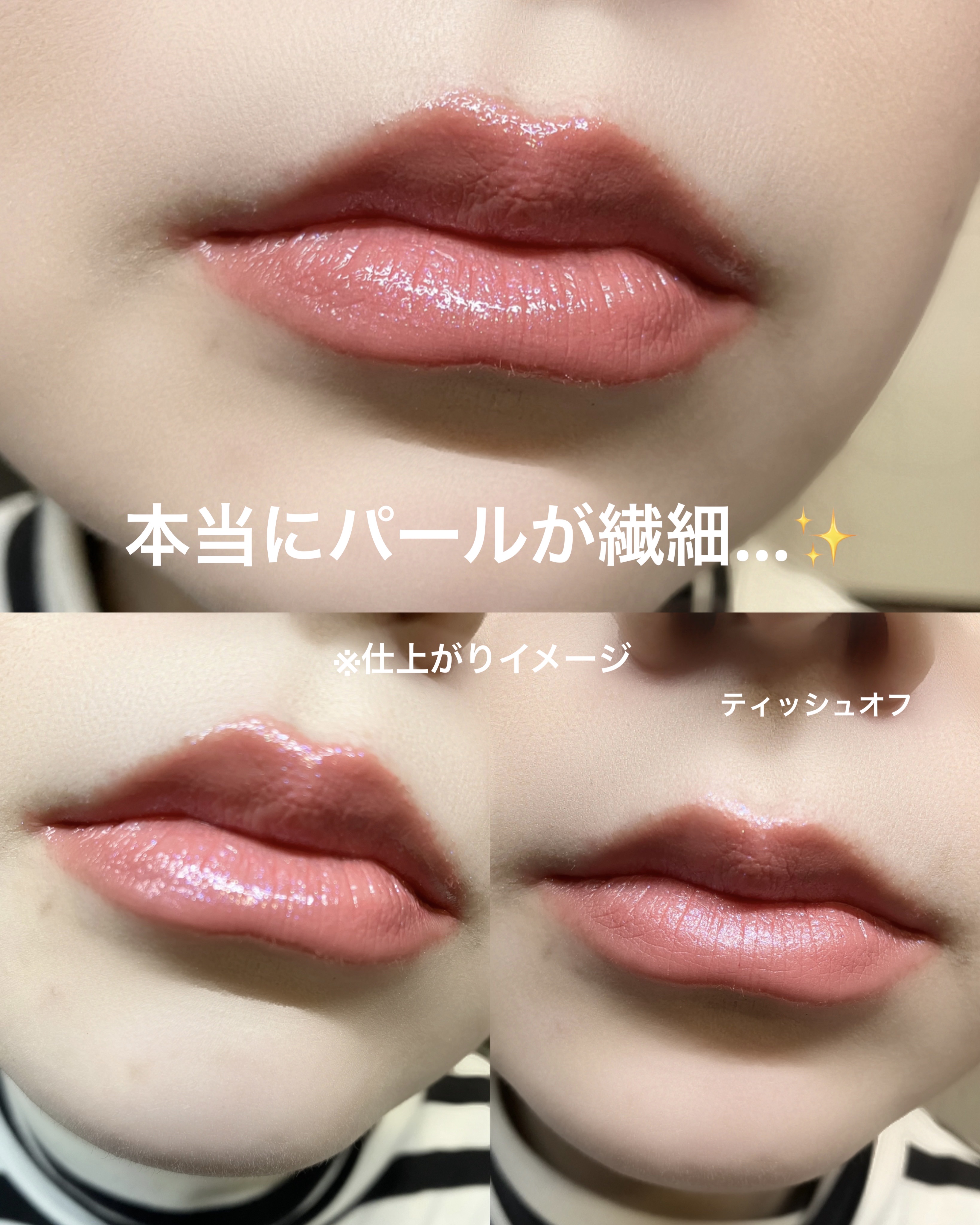 相変わらずオシャレなパケ❤️ このカラーがとてもキュート🥰 むっちり、と肌に密着しながらも伸びが良いです。 ぷるんとした質感❤️ 唇に塗ると、ほんのりスースー感。 香りはほぼないかな? カサついた私の薄い唇もふっくらナチュラルにプルンと ❤️ 透けるので、オーバーリップにする場合は重ね塗りでたっぷりした方が良さそう。 しっとりして👌 グロスのむちむち感はありますが、私には不快なベタベタ感ではなかったです。 また、ティッシュオフすると色は落ちちゃいますが、しっとり感は残ります❤️ 縦じわが目立ちにくくて良いです❤️ 他のリップと重ねるのも楽しみ🥰 1本持っておくと重宝しそうです☺️💕