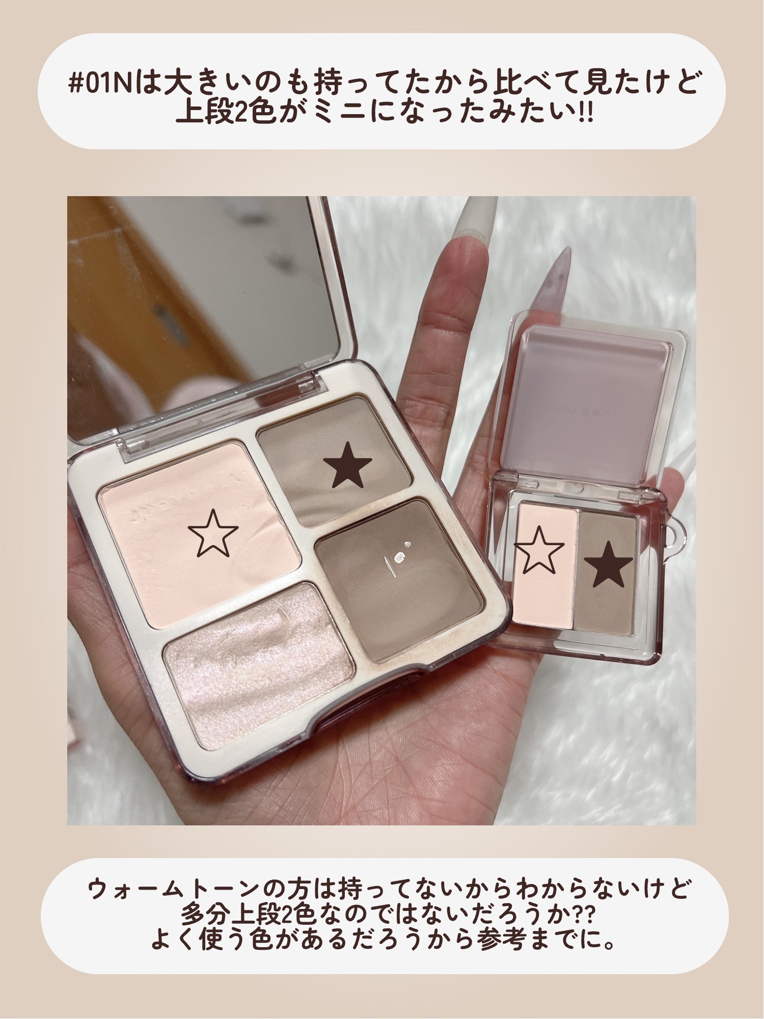 顔面のクオリティを左右すると言っても過言ではないコントゥア。 これが上手くいくと本当に顔面の偏差値爆上がりする。 影色が2色入ってるから部分によって使い分けられていい!! マットハイライトはニュートラルに比べるとベージュっぽい。 しっかりメリハリつけたい人、肌白い人という感じ。どちらも使いやすいし、顔面のクオリティが上がることは間違いない。