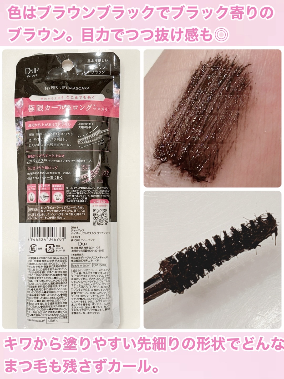 - 2024年10月1日より全国のバラエティショップ、ドラッグストア、公式オンラインショップ(https://store.d-up.co.jp/)にて発売いたします。 『ハイパーリフトマスカラ』は、“カールマスカラで本気のロング”をコンセプトに、ディーアップ史上最強のカールキープ力と驚きの長さを追求した新しいマスカラです。 ■カールキープ力とロング感の両立 カールキープ力の高いマスカラは、通常ワックスや被膜材でカールをキープしますが、同時に「ロング感」や「ダマの無い仕上がり」を両立させることは難しいとされてきました。ハイパーリフトマスカラは、あと1㎜長く、もっとなめらかにするための改良を重ね、「カールキープ力」と「ロング」どちらも限界レベルまで欲張った新処方です。 ■1㎜でも長く!「すご伸びカール」 ロングの秘密は、なめらかで“伸び感”のあるカール液。ファイバーを包み込みながら素早く毛先まで絡み、美しくスッと長いまつげを実現します。 さらに長さを出すため「まつげの根元」にも着目し、生え際から持ち上げて伸ばす、コンパクトなリフトアップカールブラシを新たに採用しました。 『ハイパーリフトマスカラ』で、想像を超える“新次元の上向きまつげ”を体験してください。