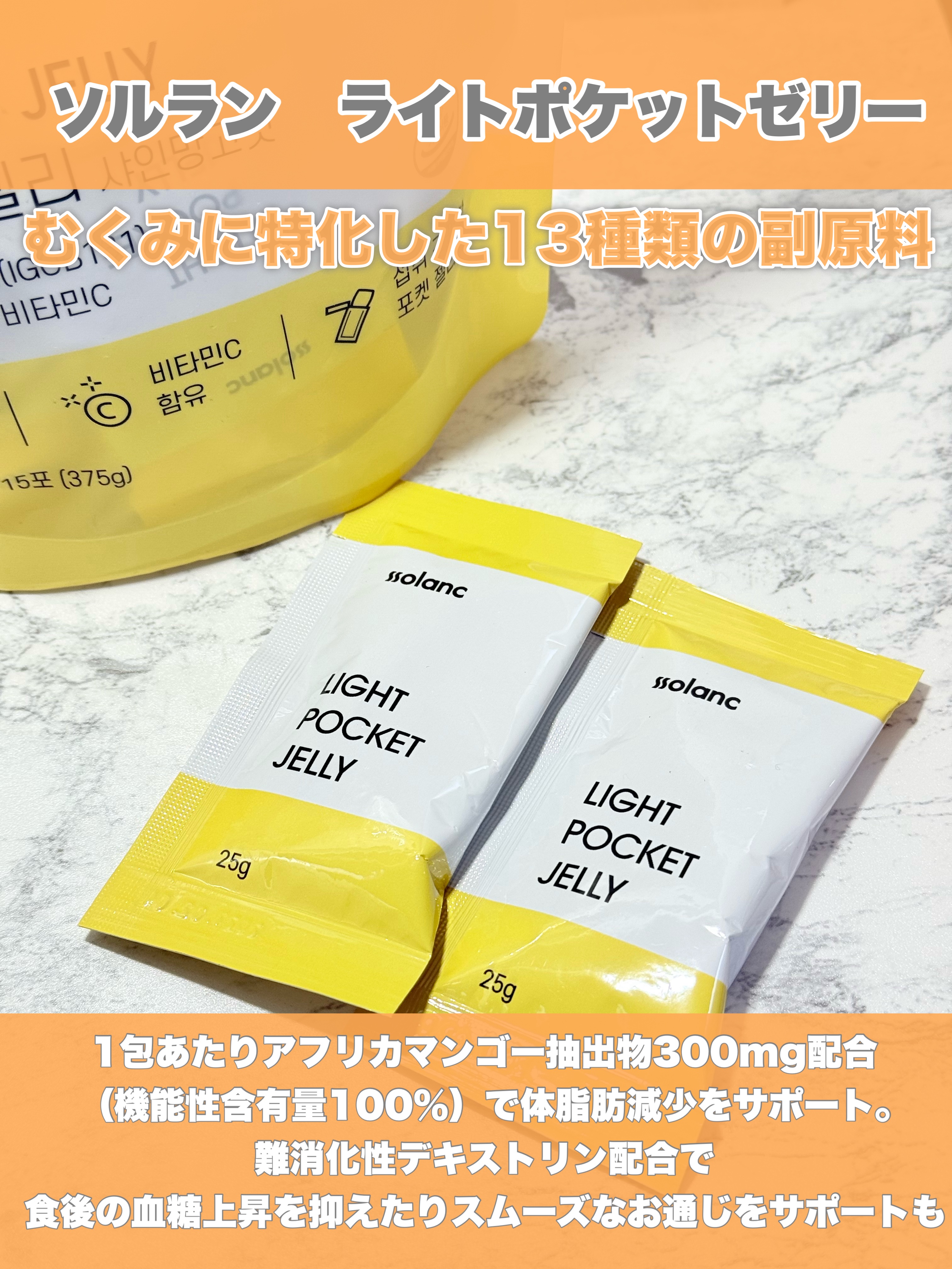・・・ssolanc(ソルラン)ライトポケットゼリー*・゜゚・*:.。..。.:*・'(*゚▽゚*)'・*:.。..。.:*・゜゚・*美味しいゼリーで体脂肪減少サポート🍃✔︎1包あたりアフリカマンゴー抽出物300mg配合(機能性含有量100%...