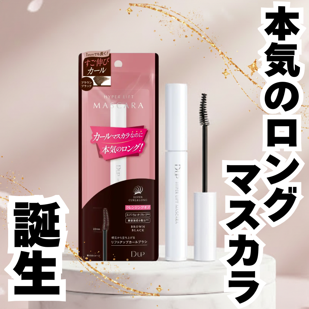 - 2024年10月1日より全国のバラエティショップ、ドラッグストア、公式オンラインショップ(https://store.d-up.co.jp/)にて発売いたします。 『ハイパーリフトマスカラ』は、“カールマスカラで本気のロング”をコンセプトに、ディーアップ史上最強のカールキープ力と驚きの長さを追求した新しいマスカラです。 ■カールキープ力とロング感の両立 カールキープ力の高いマスカラは、通常ワックスや被膜材でカールをキープしますが、同時に「ロング感」や「ダマの無い仕上がり」を両立させることは難しいとされてきました。ハイパーリフトマスカラは、あと1㎜長く、もっとなめらかにするための改良を重ね、「カールキープ力」と「ロング」どちらも限界レベルまで欲張った新処方です。 ■1㎜でも長く!「すご伸びカール」 ロングの秘密は、なめらかで“伸び感”のあるカール液。ファイバーを包み込みながら素早く毛先まで絡み、美しくスッと長いまつげを実現します。 さらに長さを出すため「まつげの根元」にも着目し、生え際から持ち上げて伸ばす、コンパクトなリフトアップカールブラシを新たに採用しました。 『ハイパーリフトマスカラ』で、想像を超える“新次元の上向きまつげ”を体験してください。
