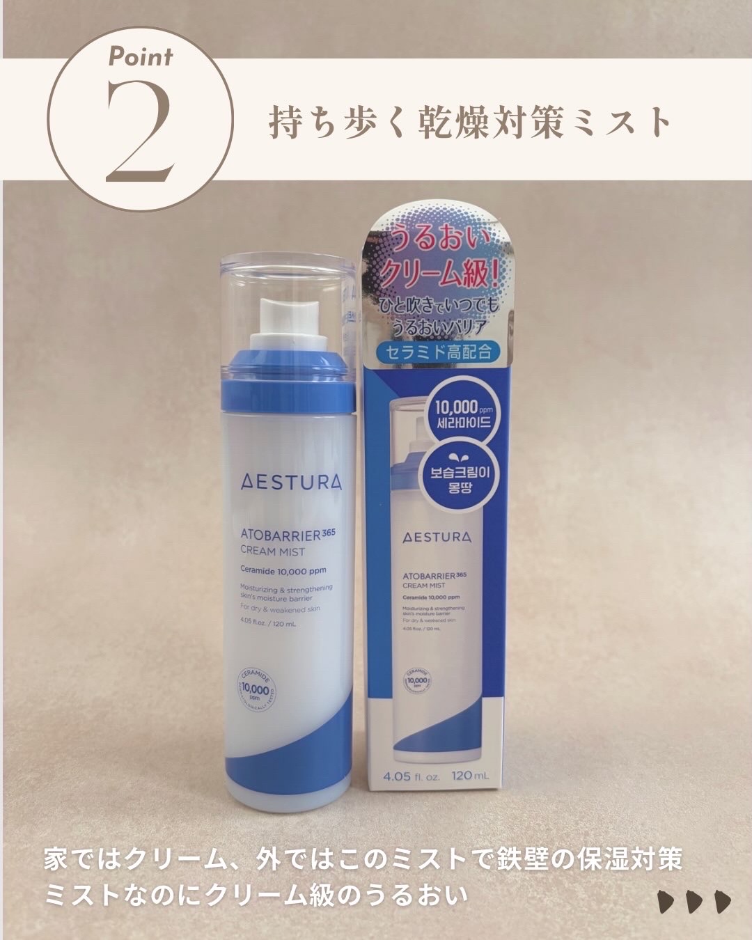 エストラ アトバリア365「クリーム」&「クリームミスト」でALL DAY保湿🚿 セラミド高配合だから、ミスト化粧水なのにクリーム級のうるおい感でしっとり〜🫧 独自『高密度セラミドカプセル約100万個配合。つぶつぶのカプセルが肌に溶けだし、肌表面に長くとどまってうるおい続くんだって!