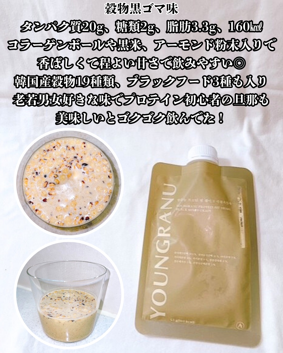 ♡YOUNGRANUヨンラニュープロテインフィットシェイク@youngranu_official_jp さまのプロテインシェイクです😍6種類もあるよー✨穀物ゴマ.ココア.スイートコーン.ピスタチオ味.よもぎラテ.あずきピンスと種類があって味ご...