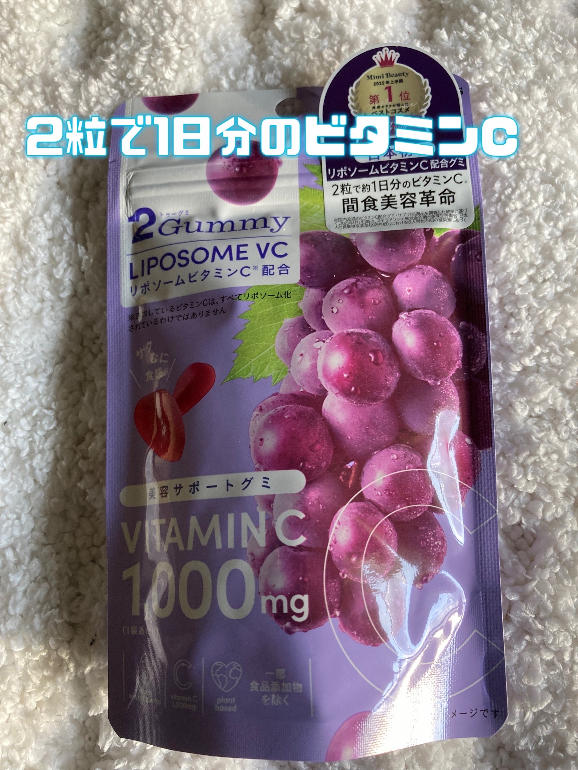 - 「食べるリポソームビタミンC」登場。2Gummyは、話題のリポソームビタミンCを配合したグミ。量と頻度に着目し、1袋にビタミンCを1,000mg配合。おやつ感覚で、いつでもどこでもビタミンCをチャージできます。