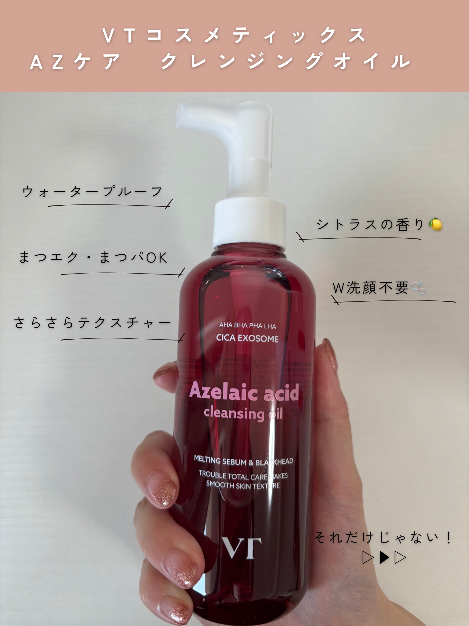 - 最近話題の毛穴ケア・整肌成分アゼライン酸!VTからはクレンジングオイルが登場! ポイントメイクまで落とすしっかりした洗浄力で、毛穴・皮脂までケアし保湿まで叶える一石三鳥アゼライン酸クレンジングオイル。 19種の植物性オイル*1も配合で、目に見えるブラッドヘッド*2から、隠れているホワイトヘッド*2、皮脂まですっきりケアします! ダブル洗顔不要! ※パッケージリニューアル ■このような方へおすすめ メイク・毛穴までディープクレンジング求める方 クレンジングでスキンケアまで行いたい方 ツッパリ感の少ないクレンジングを探していた方 ブラックヘッド*ケアも行いたい方 *1ダイズ油、アルガニアスピノサ核油、ユズ果実油、コメヌカ油、オタネニンジン種子油、アーモンド油、ザクロ種子油、リンゴ種子油、ホホバ種子油、ツバキ種子油、、バオバブ種子油、ユチャ種子油、ベニバナ種子油、ヒマワリ種子油、ヒポファエラムノイデス油、オリーブ果実油、アボカド油、アンズ核油、クロフサスグリ種子油(いずれも保湿) *2古い角質による