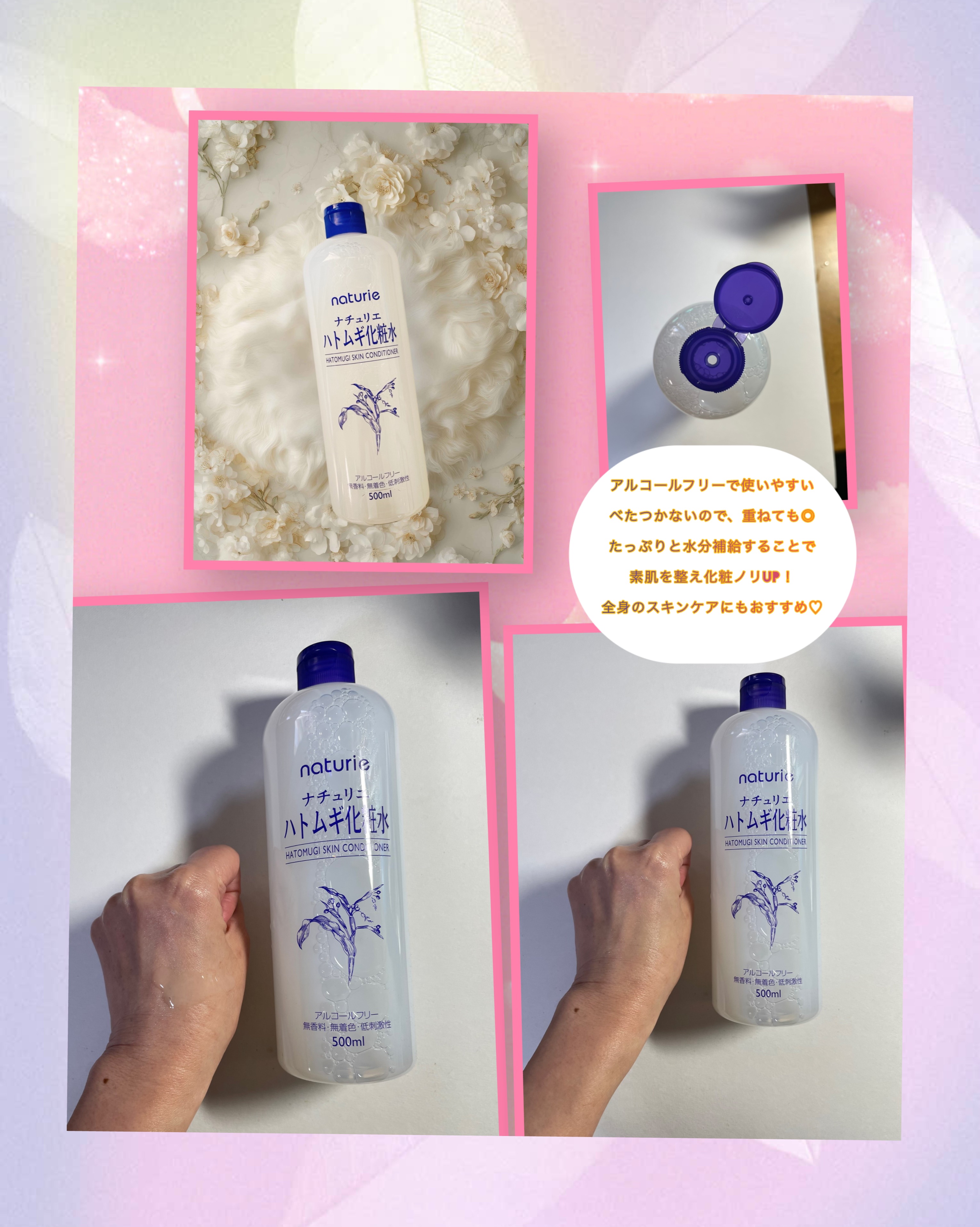 自分の肌質にあっているようで何度もリピートしている大好きなハトムギ化粧水。プチプラなのに大容量なので惜しみなく全身にも使います。 サッパリしていてベタつかないし、良い意味で水みたいな感じです。 大きな容器なので、使いやすいサイズのスプレーボトルに詰め替えて使っています!