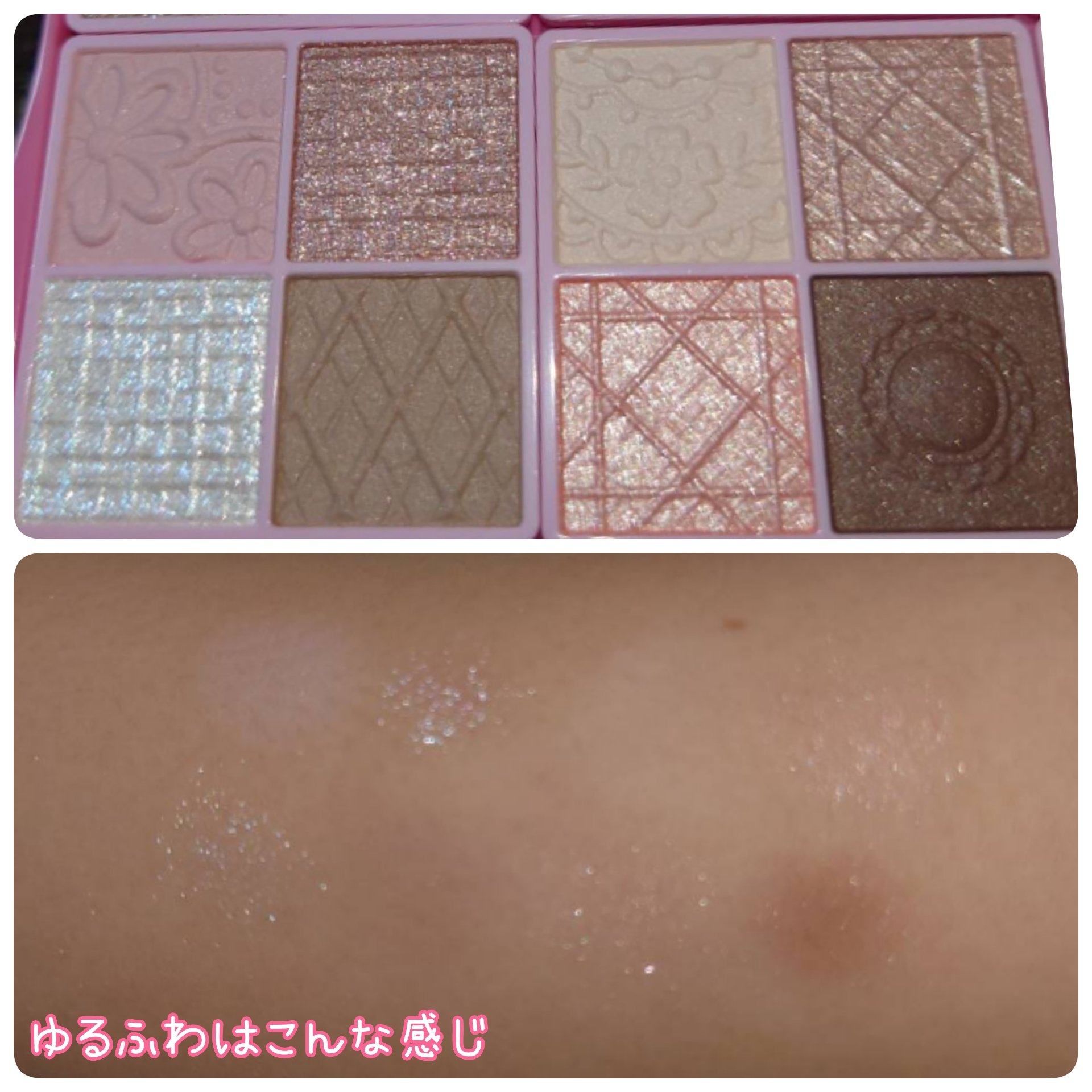 まずは右下の茶色でかげを描くそしたら左上の白色でハイライトを描くそこをピンクで塗るラメはお好みでつけると可愛くて良き!ミルフィーぷくぷく涙袋パレット03スイートラベンダー左上のハイライトはクリームタイプだけどサラサラしてていい感じ!左下のピン...