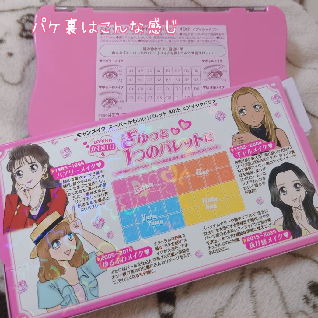 【スーパーかわいい!パレット40th】キャンメイク40周年✨32色も入った限定パレット💕40周年ってすごい❣️懐かしいあの頃から今までに流行ったメイクがひとつのパレットに✨🩷バブリーメイク(1985〜1994)💜ギャルメイク(1995〜200...