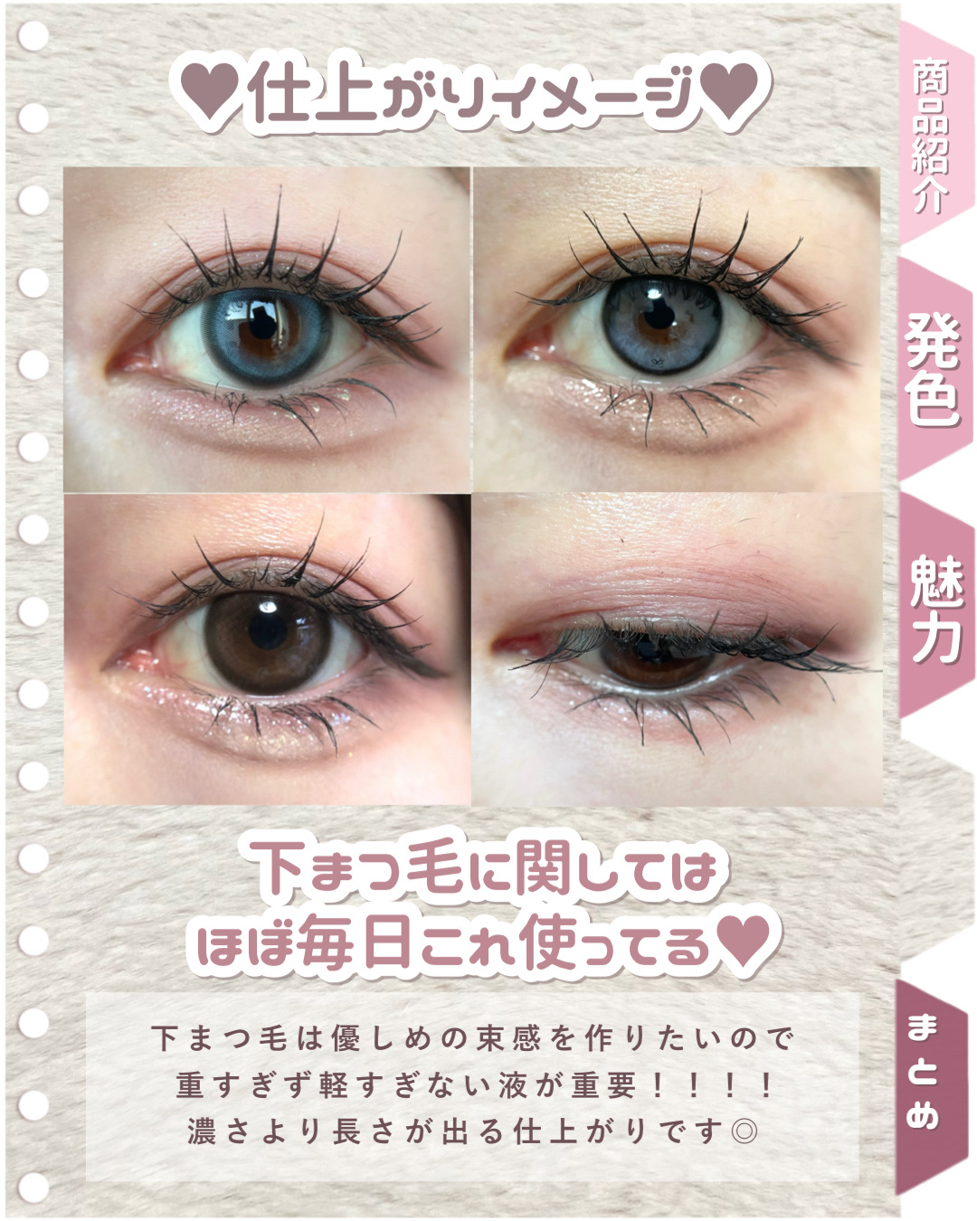 1本でマスカラ下地・マスカラ・トップコートの3役! にじみ&湿気によるカール落ちを防いでくるんと上向きまつ毛長時間続く グレージュはまつ毛を強調しつつも、垢抜けた印象にしてくれます。ブラウンだと物足りないけど、黒だと強すぎると感じるときに使っています。 このクオリティーで638はコスパ最高だと思います✨ 今後もリピしたいです❣️