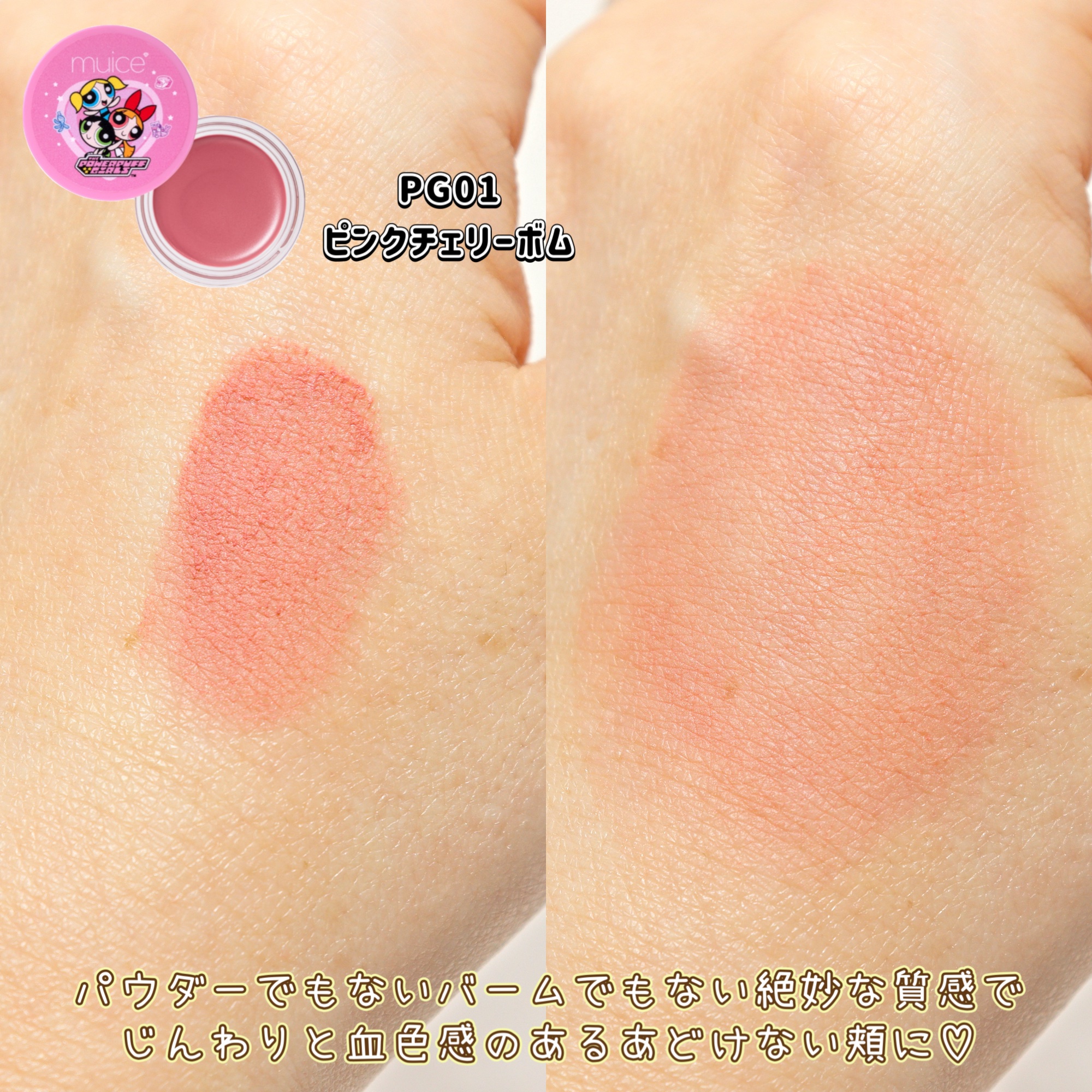 「muice(ミュアイス)」×「パワーパフガールズ」の限定コラボアイテムが登場💗⚜️muiceスフレdeチークPG01ピンクチェリーボムスポットメンテパウダーPG01オサエテミント/PG02ビハダピンク/PG03トウメイカンブルーちゅるリップ...