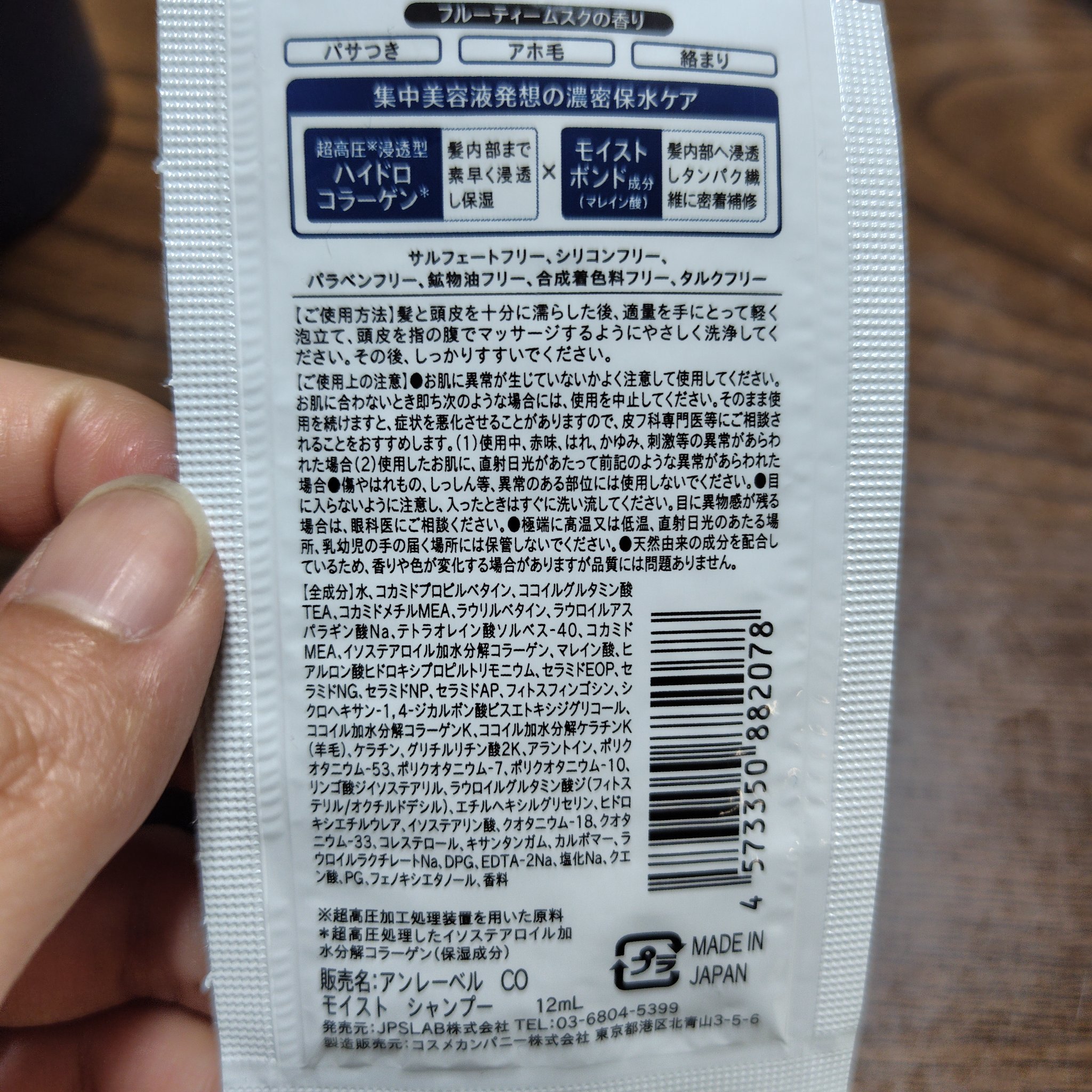 - <シャンプー 本体(400ml)> 水、コカミドプロピルベタイン、ココイルグルタミン酸TEA、コカミドメチルMEA、ラウリルベタイン、ラウロイルアスパラギン酸Na、テトラオレイン酸ソルベス-40、コカミドMEA、イソステアロイル加水分解コラーゲン、マレイン酸、ヒアルロン酸ヒドロキシプロピルトリモニウム、セラミドEOP、セラミドNG、セラミドNP、セラミドAP、フィトスフィンゴシン、シクロヘキサン-1,4-ジカルボン酸ビスエトキシジグリコール、ココイル加水分解コラーゲンK、ココイル加水分解ケラチンK(羊毛)、ケラチン、グリチルリチン酸2K、アラントイン、ポリクオタニウム-53、ポリクオタニウム-7、ポリクオタニウム-10、リンゴ酸ジイソステアリル、ラウロイルグルタミン酸ジ(フィトステリル/オクチルドデシル)、エチルヘキシルグリセリン、ヒドロキシエチルウレア、イソステアリン酸、クオタニウム-18、クオタニウム-33、コレステロール、キサンタンガム、カルボマー、ラウロイルラクチレートNa、DPG、EDTA-2Na、塩化Na、クエン酸、PG、フェノキシエタノール、香料 <ヘアトリートメント 本体(400ml)> 水、セタノール、ベヘントリモニウムクロリド、イソステアロイル加水分解コラーゲン、マレイン酸、ヒアルロン酸ヒドロキシプロピルトリモニウム、セラミドEOP、セラミドNG、セラミドNP、セラミドAP、フィトスフィンゴシン、シクロヘキサン-1,4-ジカルボン酸ビスエトキシジグリコール、エクトイン、スクワラン、ケラチン、オリーブ果実油、ホホバ種子油、マカデミア種子油、ローズヒップ油、エチルヘキシルグリセリン、アモジメチコン、ジメチコン、ジステアリルジモニウムクロリド、ダイマージリノール酸ダイマージリノレイルビス(ベヘニル/イソステアリル/フィトステリル)、リンゴ酸ジイソステアリル、ステアリン酸グリセリル、イソステアリン酸、クオタニウム-18、クオタニウム-33、ラウロイルラクチレートNa、コレステロール、キサンタンガム、カルボマー、クエン酸Na、クエン酸、PG、イソプロパノール、エタノール、フェノキシエタノール、香料 <シャンプー 詰め替え(310ml)> 水、コカミドプロピルベタイン、ココイルグルタミン酸TEA、コカミドメチルMEA、ラウリルベタイン、ラウロイルアスパラギン酸Na、テトラオレイン酸ソルベス-40、コカミドMEA、イソステアロイル加水分解コラーゲン、マレイン酸、ヒアルロン酸ヒドロキシプロピルトリモニウム、セラミドEOP、セラミドNG、セラミドNP、セラミドAP、フィトスフィンゴシン、シクロヘキサン-1,4-ジカルボン酸ビスエトキシジグリコール、ココイル加水分解コラーゲンK、ココイル加水分解ケラチンK(羊毛)、ケラチン、グリチルリチン酸2K、アラントイン、ポリクオタニウム-53、ポリクオタニウム-7、ポリクオタニウム-10、リンゴ酸ジイソステアリル、ラウロイルグルタミン酸ジ(フィトステリル/オクチルドデシル)、エチルヘキシルグリセリン、ヒドロキシエチルウレア、イソステアリン酸、クオタニウム-18、クオタニウム-33、コレステロール、キサンタンガム、カルボマー、ラウロイルラクチレートNa、DPG、EDTA-2Na、塩化Na、クエン酸、PG、フェノキシエタノール、香料 <ヘアトリートメント 詰め替え(310ml)> 水、セタノール、ベヘントリモニウムクロリド、イソステアロイル加水分解コラーゲン、マレイン酸、ヒアルロン酸ヒドロキシプロピルトリモニウム、セラミドEOP、セラミドNG、セラミドNP、セラミドAP、フィトスフィンゴシン、シクロヘキサン-1,4-ジカルボン酸ビスエトキシジグリコール、エクトイン、スクワラン、ケラチン、オリーブ果実油、ホホバ種子油、マカデミア種子油、ローズヒップ油、エチルヘキシルグリセリン、アモジメチコン、ジメチコン、ジステアリルジモニウムクロリド、ダイマージリノール酸ダイマージリノレイルビス(ベヘニル/イソステアリル/フィトステリル)、リンゴ酸ジイソステアリル、ステアリン酸グリセリル、イソステアリン酸、クオタニウム-18、クオタニウム-33、ラウロイルラクチレートNa、コレステロール、キサンタンガム、カルボマー、クエン酸Na、クエン酸、PG、イソプロパノール、エタノール、フェノキシエタノール、香料 <シャンプー 詰め替え1.9倍> 水、コカミドプロピルベタイン、ココイルグルタミン酸TEA、コカミドメチルMEA、ラウリルベタイン、ラウロイルアスパラギン酸Na、テトラオレイン酸ソルベス-40、コカミドMEA、イソステアロイル加水分解コラーゲン、マレイン酸、ヒアルロン酸ヒドロキシプロピルトリモニウム、セラミドEOP、セラミドNG、セラミドNP、セラミドAP、フィトスフィンゴシン、シクロヘキサン-1,4-ジカルボン酸ビスエトキシジグリコール、ココイル加水分解コラーゲンK、ココイル加水分解ケラチンK(羊毛)、ケラチン、グリチルリチン酸2K、アラントイン、ポリクオタニウム-53、ポリクオタニウム-7、ポリクオタニウム-10、リンゴ酸ジイソステアリル、ラウロイルグルタミン酸ジ(フィトステリル/オクチルド