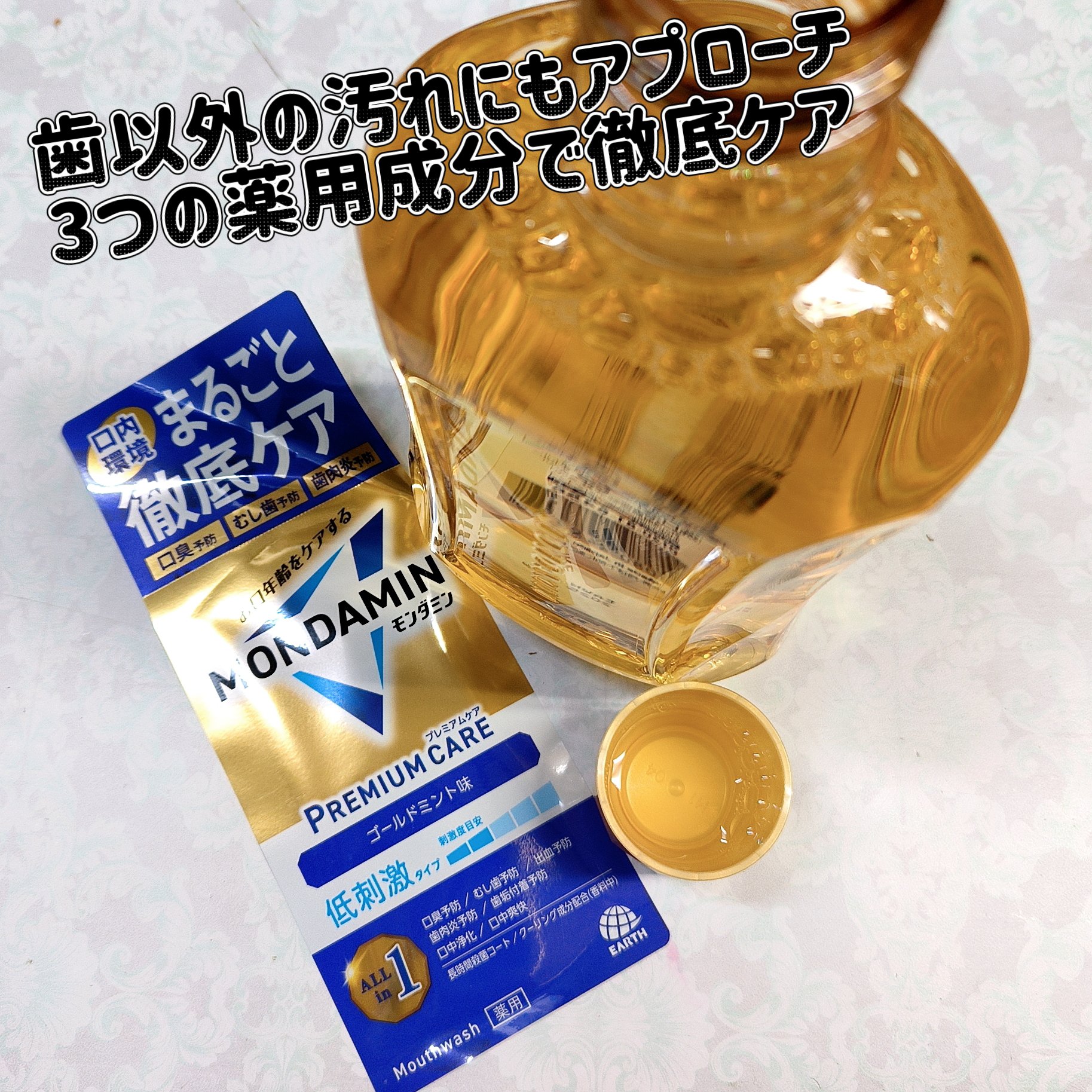.モンダミンプレミアムケアゴールドミントをおためししました。口内環境まるごと徹底ケアの医薬部外品洗口液です。殺菌成分CPC*1(有効成分)抗炎症成分GK2*2(有効成分)出血予防成分TXA*3(有効成分)が配合されています。今回は1000ml...