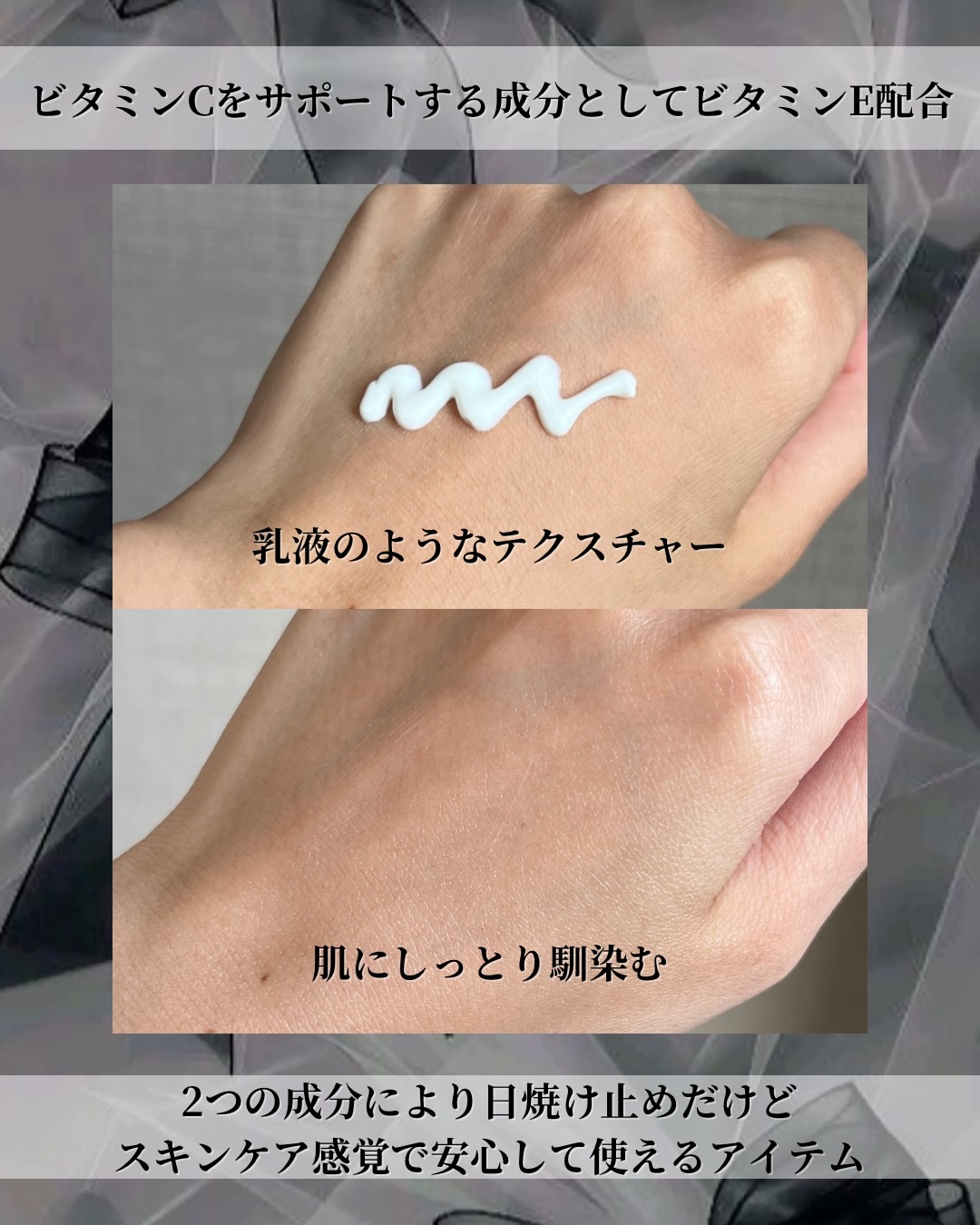 - 純粋ビタミンC*と天然成分、そして整肌成分のシナジー配合で、乾燥と紫外線、皮脂ケアを一度に管理する水分膜日焼け止め *保湿成分