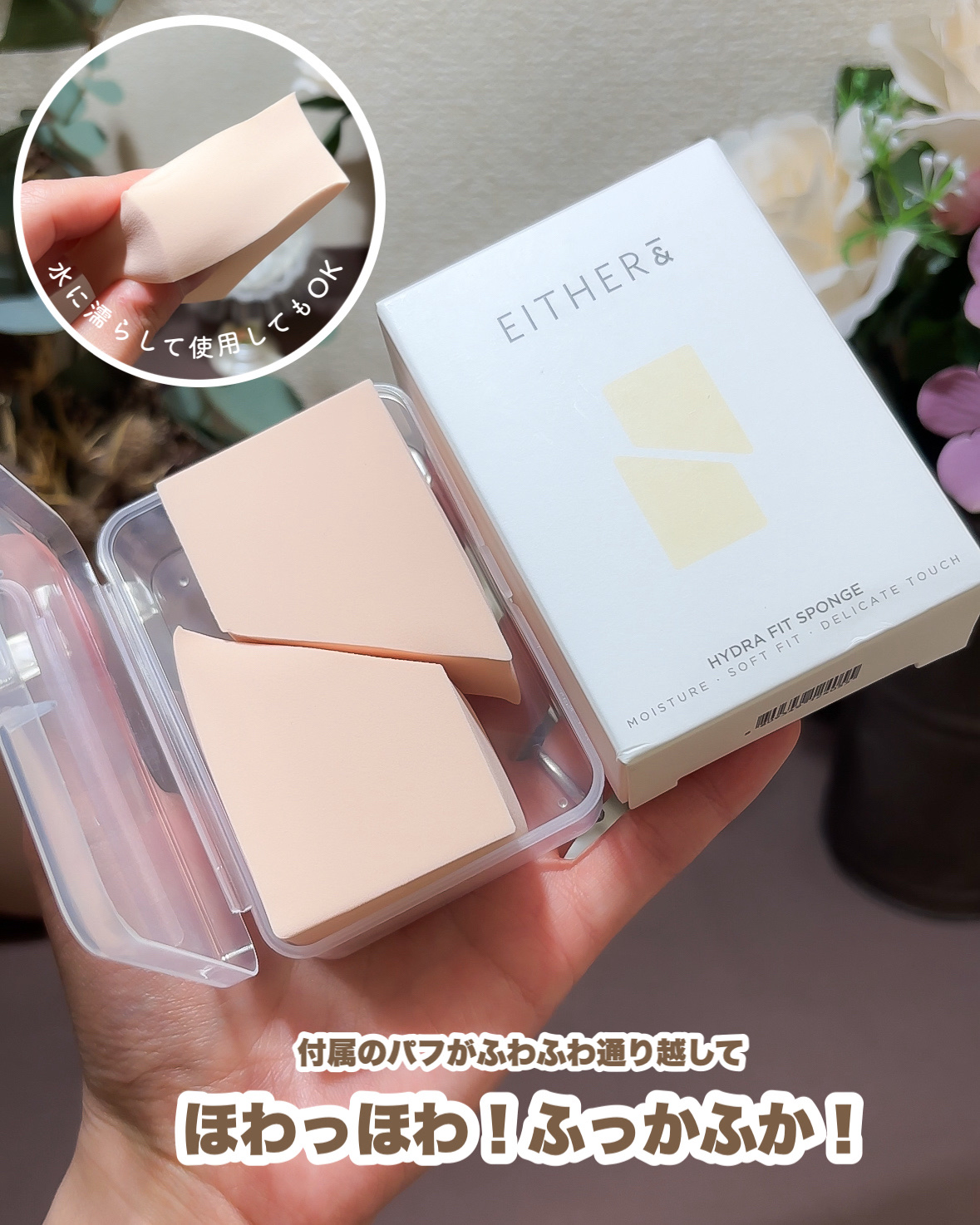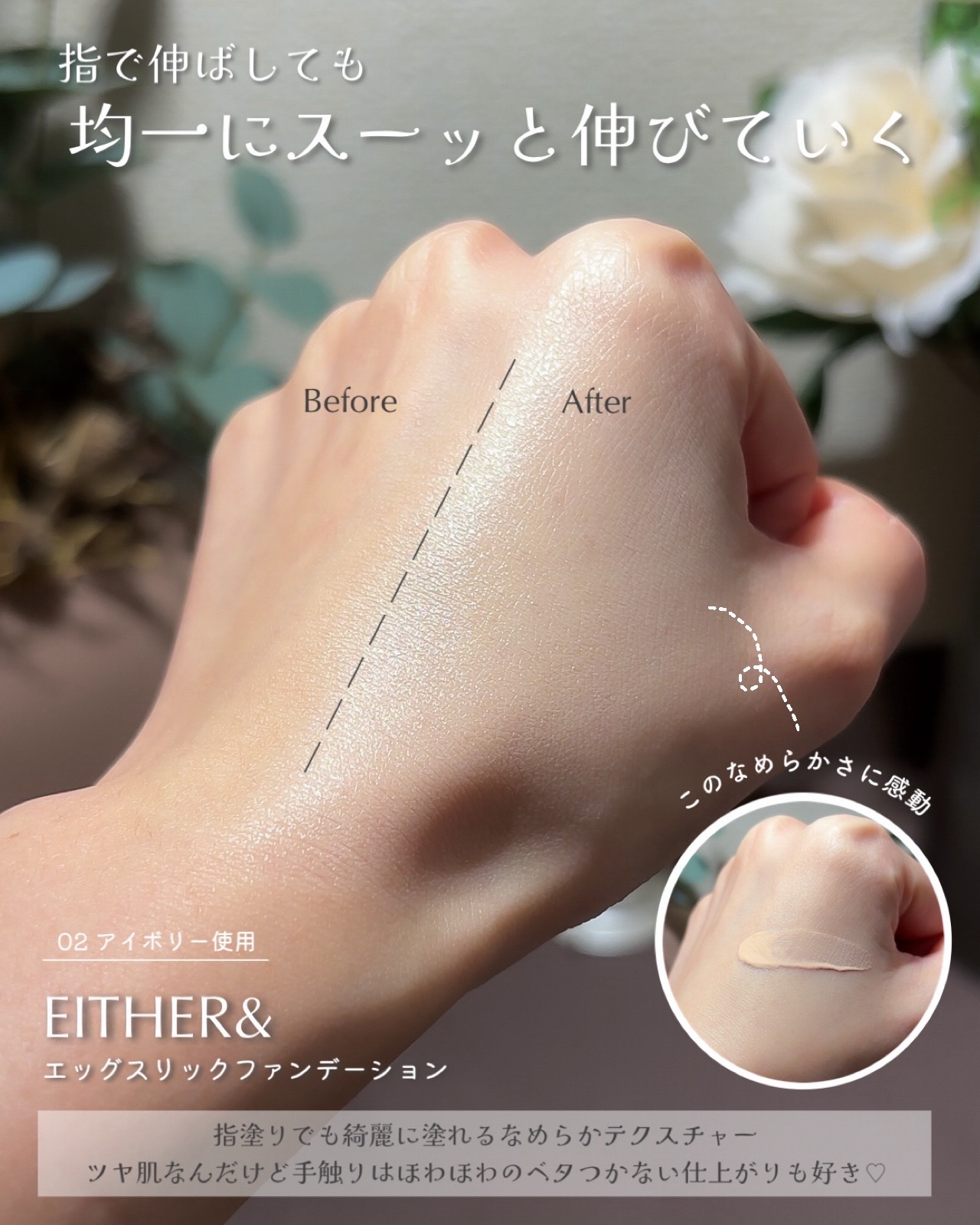 *EITHER&グレーズドリップオイルエッグスリックファンデーション+専用プレミアムパフファンデーションは美容液を塗っているかのような伸びと肌なじみの良さ◎スキンケア後のようなみずみずしさに🥹もちもちしたパフで密着力UP⤴︎しっと...