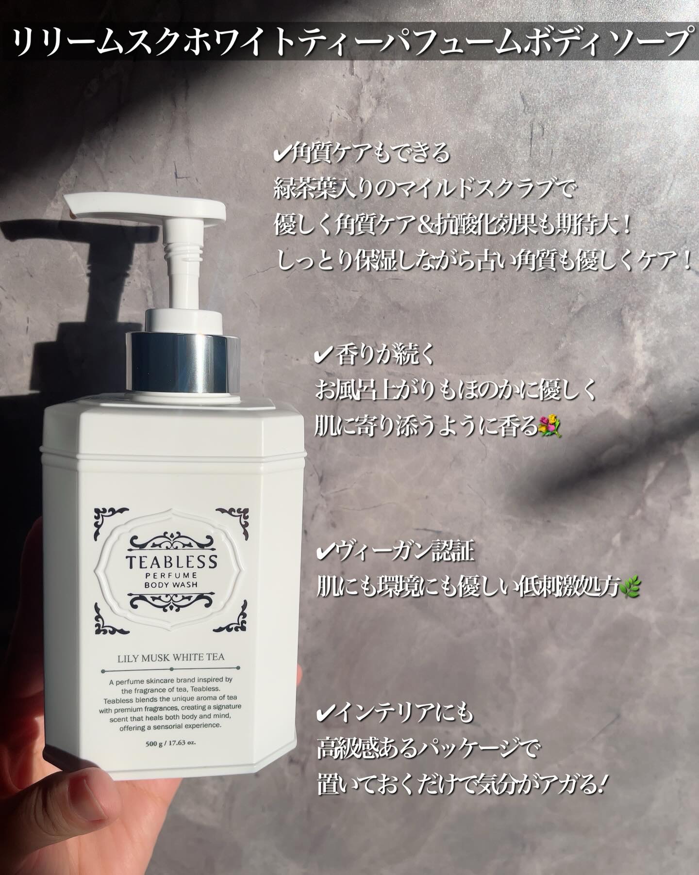 TEABLESSパフュームボディウォッシュリリームスクホワイトティー🫧🫖パケもオシャレでお風呂のインテリアにも◎🫖🫧白茶の香りとムスクの香り🌱茶葉入りで優しく角質ケアここがめっちゃ推しポイント✨🫧モコモコ泡マイルドなスクラブ効果があるボディソ...