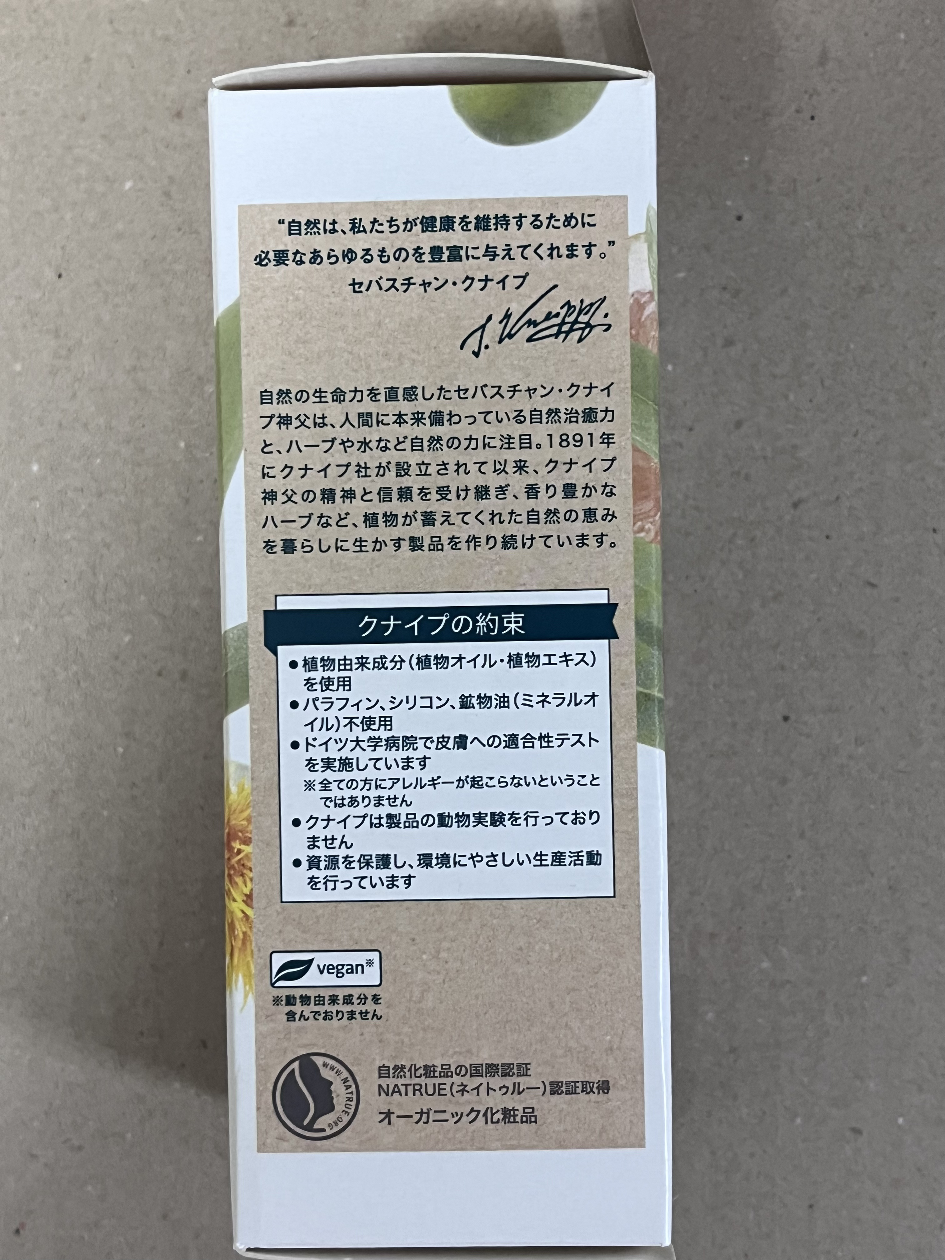 - パッケージがナチュラルで洗練された雰囲気にリニューアル。 オーガニック保湿ケアオイルで、なめらか肌に。 お顔だけでなく全身に使える保湿ケアオイル。 100%天然由来植物成分配合。スッと肌になじみます。 植物の恵みでやさしく潤し、肌本来のもつ力をサポートします。 さわやかな天然のグレープフルーツの香りで気分リフレッシュ。 ●オーガニック国際認証 NATRUE(ネイトゥルー)取得 「NATRUE」は自然・オーガニック化粧品に関する厳格な維持を目的として2007年に設立された国際的な非営利団体です。 クナイプビオ オイルは、「NATRUE」の中でも最高ランクである「オーガニック化粧品」の認証を取得しています。