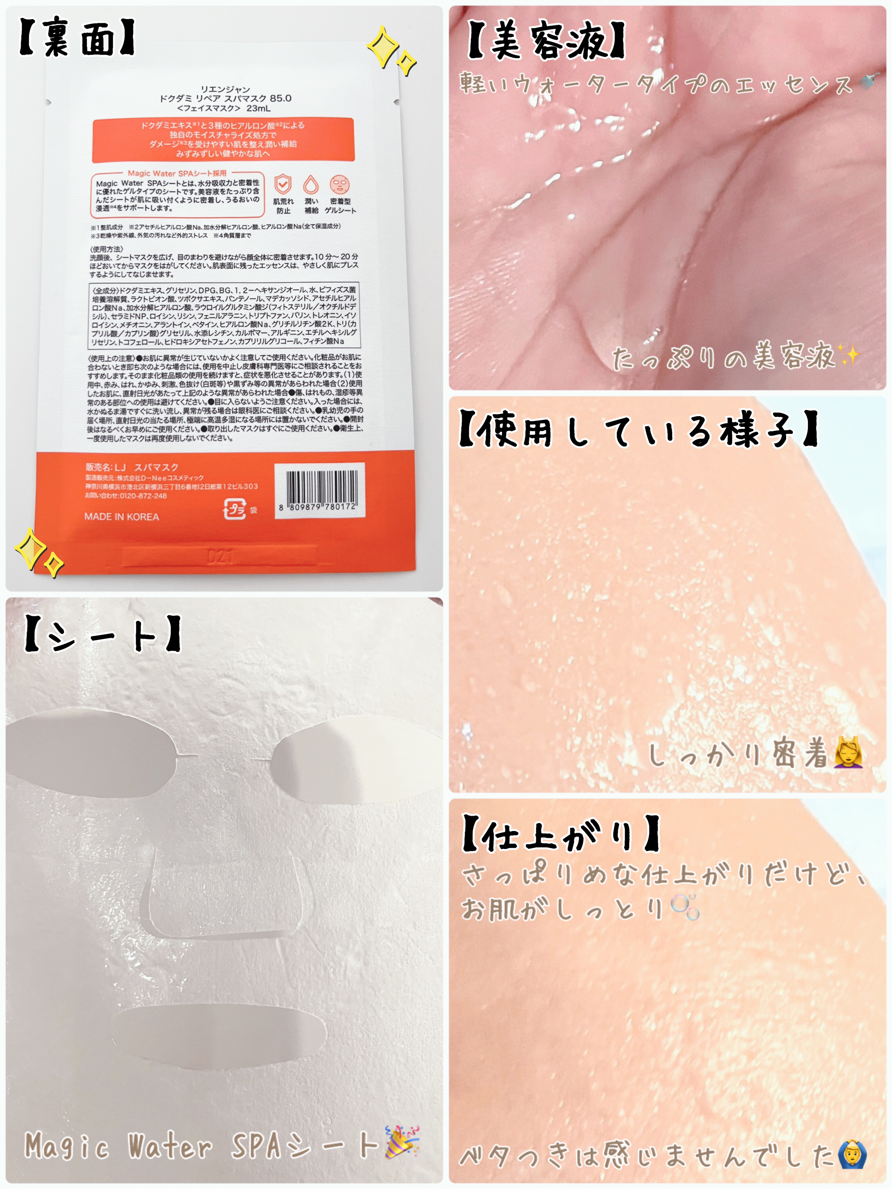 85%が植物由来エキス、ドクダミ由来エキス配合 ・NMF、3種のヒアルロン酸、AminoCera1.5の5層の保湿 ぷるぷるのゲルタイプマスクシートにドクダミ由来エキス配合の保湿エッセンスがたっぷり染み込んでいてとっても気持ちいい質感 乾燥が気になる方 ・美容液たっぷりのマスクでリラックスしたい方