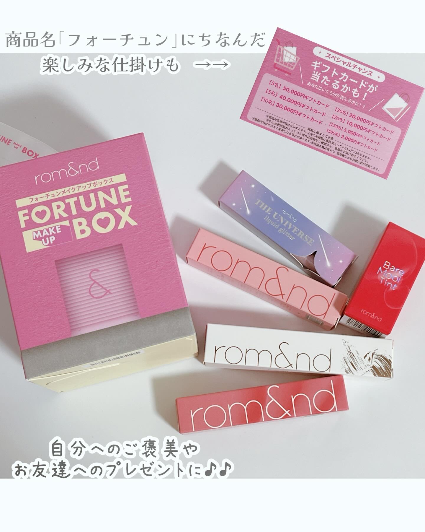 #PRrom&nd@romand_jp@remake_officialFORTUNEMAKEUPBOXrom&ndの大人気商品がランダムに詰め込まれたスペシャルフォーチュンボックス💗商品構成①ハンオールブロウカラ②リキッドグリッターシャドウ③...