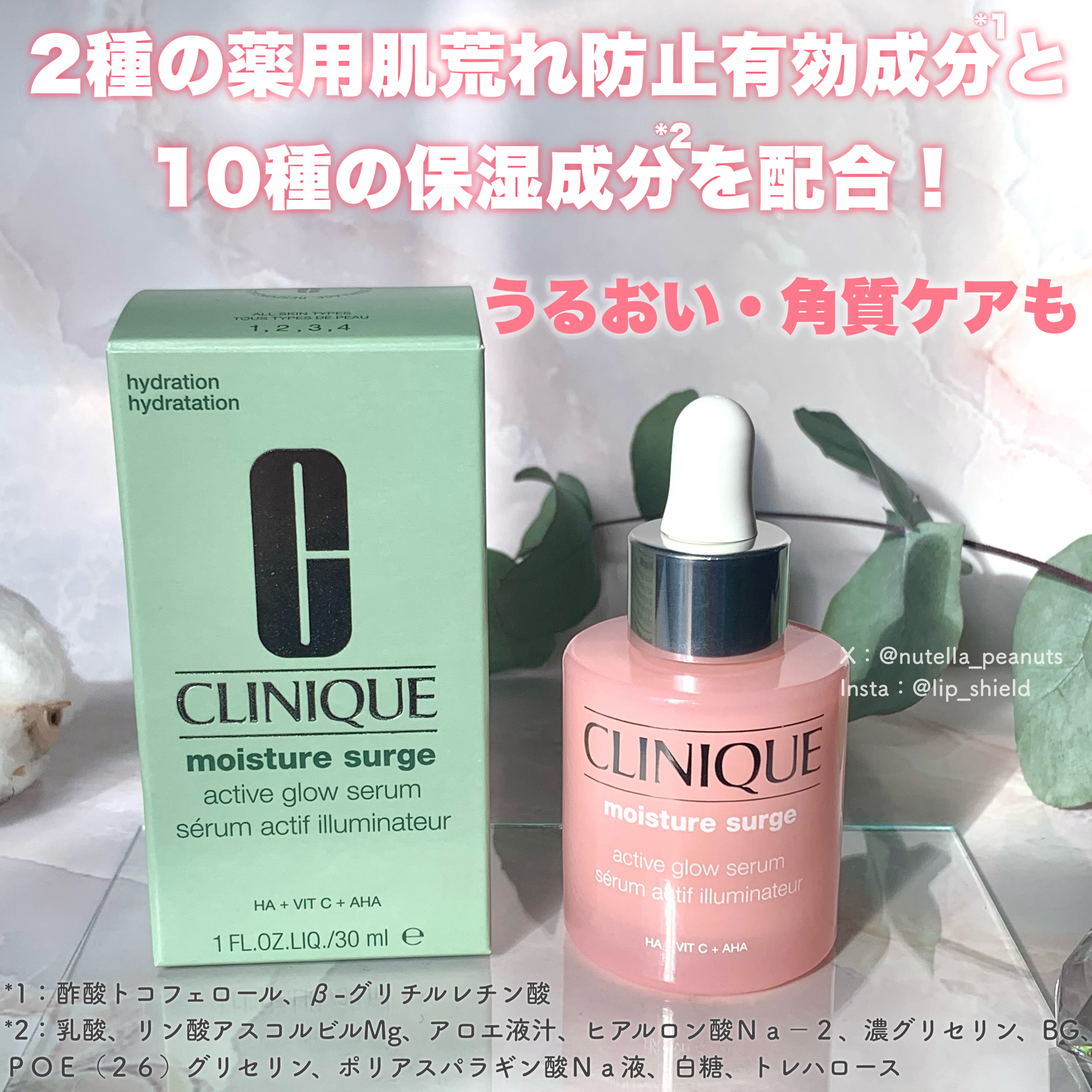 - 「肌荒れ防止有効成分*1」+「モイスチャー ドロップ カクテル*2」配合。 “乾燥⇄肌荒れ”の負のループに着目した、新・薬用保湿美容液登場。 わずか0.02mmの角質層に備わる「モイスチャーバリア」。 紫外線や空調、ストレスなど、さまざまな要因で角質が乱れると、水分が逃げやすくなり肌の乾燥が進みます。 乾燥することでバリア機能が弱まり、肌荒れを引き起こし、さらに乾燥するという負のループに陥りがち。 皮膚科学発想のクリニークの保湿シリーズ「モイスチャーサージ」から、肌荒れと乾燥、両面にアプローチする、新・薬用保湿美容液が誕生。 乾燥や外的刺激で、乱れがちな肌を健やかに整える、2種の「肌荒れ防止有効成分*1」と、潤いの循環設計で、みずみずしく肌を満たす10種の保湿成分をブレンドした「モイスチャー ドロップ カクテル*2」配合。 肌馴染みのいい乳白色のミルキー テクスチャーが、しっとり角質をやわらげ、肌荒れを防ぎながら、潤いを巡らせ、みずみずしさをキープ。 肌も心も潤いの泉に満たされるような、ぷるんとした潤み肌に。 ・敏感肌対応*3 ・香料不使用 ・アレルギーテスト済*4 ・日本人女性の肌で皮膚刺激性テスト済み*5 *1 酢酸トコフェロール、β-グリチルレチン酸 *2 10種の潤い成分 : アロエ液汁、乳酸、ヒアルロン酸Na-2、リン酸アスコルビルMg、濃グリセリン、BG、POE(26)グリセリン、ポリアスパラギン酸Na液、白糖、トレハロース *3 すべての方に皮膚トラブルが起きないというわけではありません。 *4 すべての方にアレルギーが起きないというわけではありません。 *5 すべての方に皮膚刺激が起きないというわけではありません。 2025年10月1日(水)@cosme先行発売