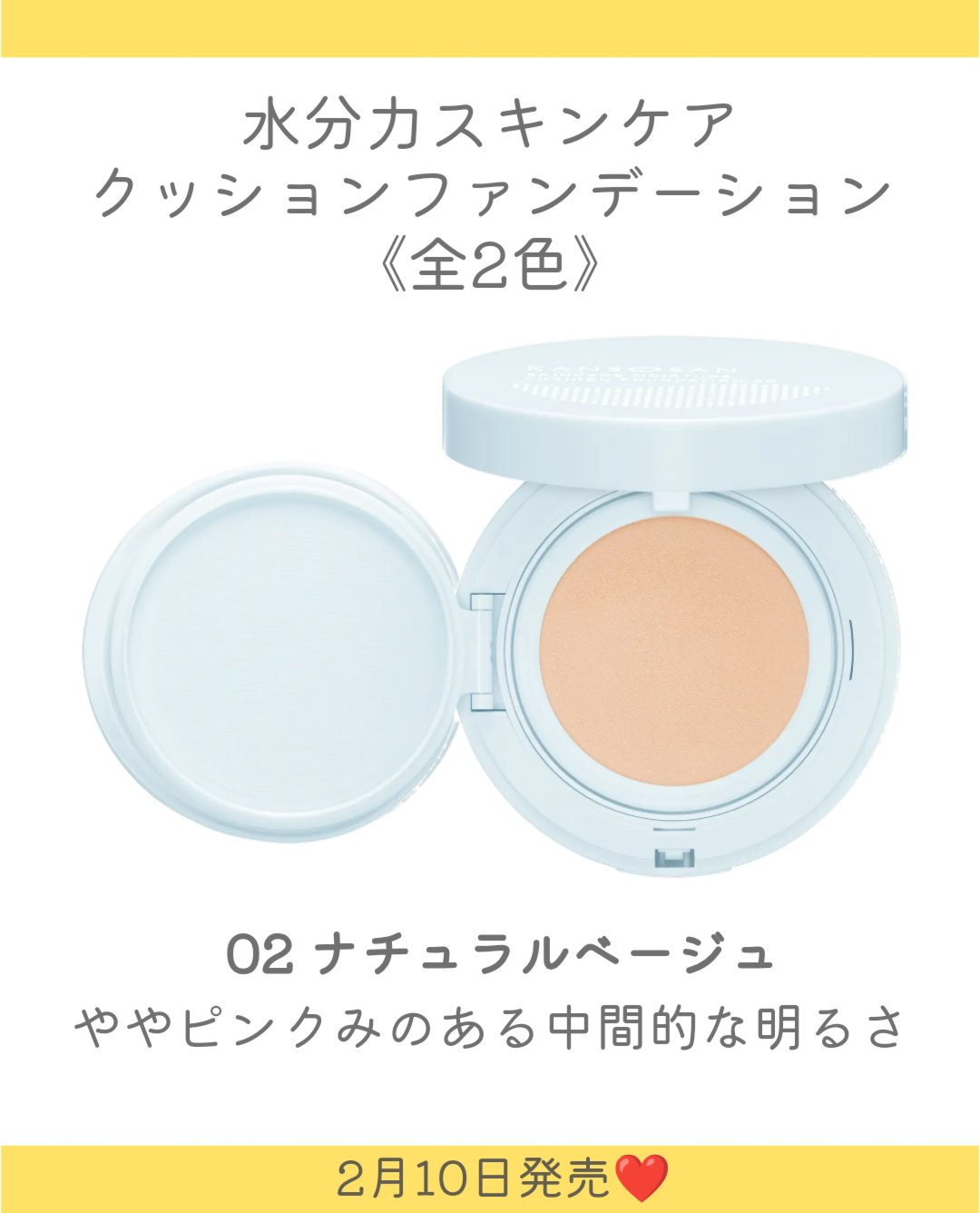 - 毛穴・色ムラをカバーし、みずみずしいツヤ肌に 美容液仕立ての水分感触で、肌悩みをつやんとカバーします。 水分タッチ設計の絹ごしメッシュ きめ細やかなメッシュ地で、ムラなくきれいにファンデーションを塗布できます。 べたつきを抑えながら、乾燥から肌を守る保水ケア 乾燥によるべたつきをカバーし、余分な皮脂や毛穴の広がりをケアします。 ・べたつき対策:ビタミンC誘導体*¹、グリシルグリシン(ひきしめ) ・潤い成分:水溶性セラミド*²、ナイアシンアミド、ワセリン、アミノ酸*³(全て保湿) これ1つで5in1効果 [乳液・美容液・クリーム・ファンデーション・コンシーラー] やさしい使い心地と7つのフリー設計 [石油系界面活性剤・パラベン・タール色素・アルコール・合成香料・酸化亜鉛・紫外線吸収剤] SPF50+・PA++++、UV耐水性★★ 汗・水に濡れても落ちにくく、夏の強い日差しから肌を守ります。 カラー展開 水分力スキンケアクッションファンデーション カラーチャート ・01 ライトベージュ:黄みよりのやや明るめ〜中間的な明るさ ・02 ナチュラルベージュ:ややピンクみのある中間的な明るさ 【使用方法】 化粧下地のあと、パフをメッシュに優しく押し当てファンデーションを適量とり、ポンポンと肌を軽くおさえるようにつけます。 *1 テトラヘキシルデカン酸アスコルビル(整肌) *2 グルコシルセラミド(保湿) *3 タウリン、リシンHCl、アラニン、ヒスチジンHCl、アルギニン、セリン、プロリン、グルタミン酸、トレオニン、バリン、ロイシン、グリシン、アラントイン、イソロイシン、フェニルアラニン(全て保湿)